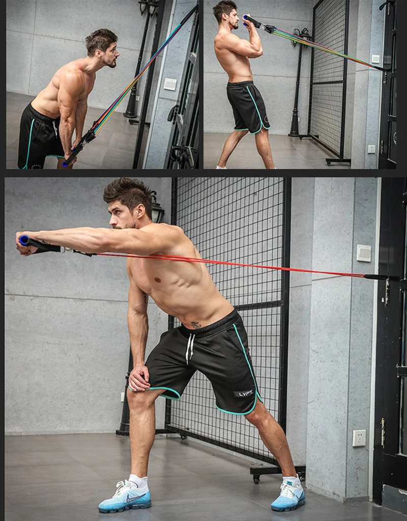Название продукта: набор из 11 канатов Материал изделия: TPE Размер продукта: 1,2 метров в длину Параметры растяжения: желтый 10 фунтов, красный 15 фунтов, зеленый 20 фунтов, синий 25 фунтов, черный 30 фунтов Подходит для толпы: мужчин, женщин, пожилых, молодых Функция продукта: потеря веса, фитнес, формирование тела, сила, тренировка