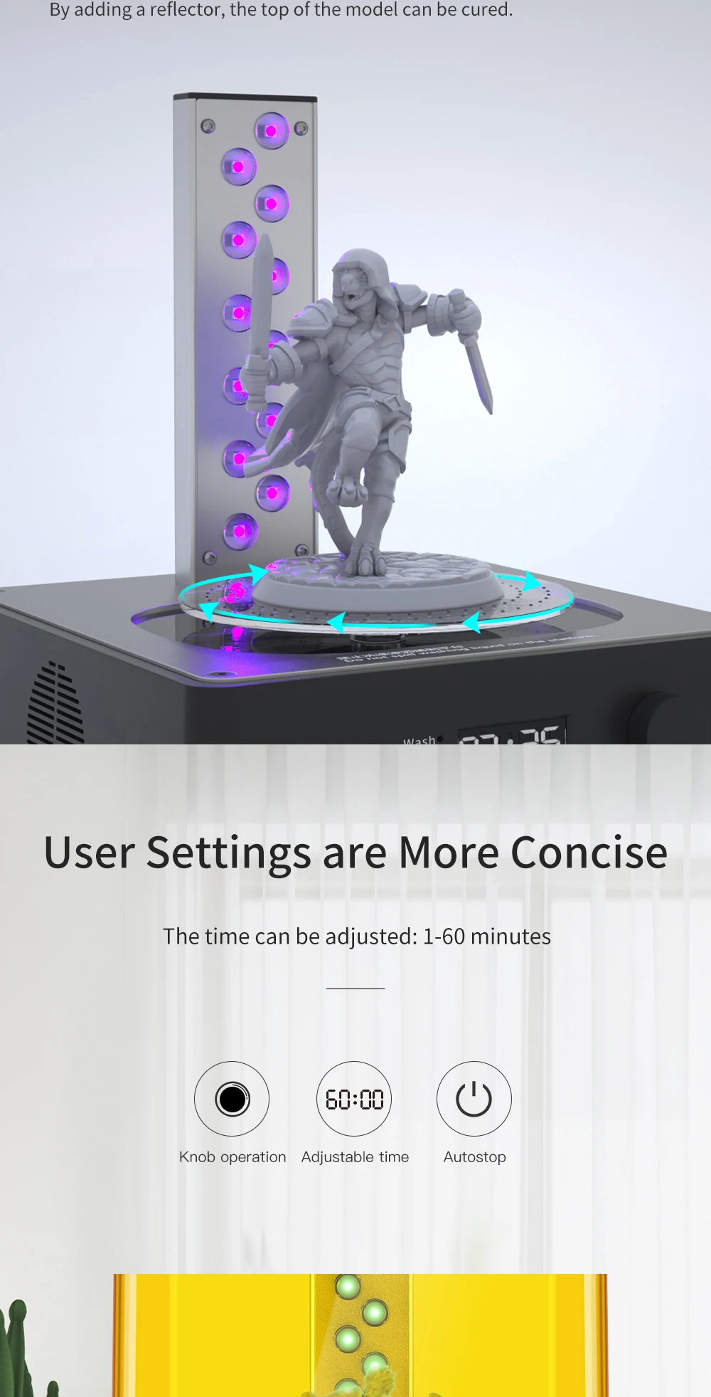 Платформа вращается на 360 ° для обеспечения равномерного и полного отверждения. Добавив отражатель, верхняя часть модели может быть вылечена.