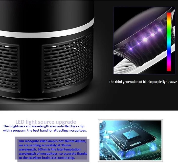 -Цвет: белый или черный -Материал: АБС-пластик -Размер: большая модель: 13x13x19 см маленькая модель: 12x12x8.5cm -Кабеля: около 1,1 м -Номинальная мощность: 7 Вт -Номинальное напряжение: 220 В -Входное напряжение: 5 В -Площадь: 120 квадратных метров -Питание от: USB -Принцип работы: бионическая ловушка, физическое убивание комаров -Область применения: домашний интерьер, спальня, учебная комната, кухня, внутренний двор и т. д. Особенности: -Светодиодный светильник обновления источника Яркость и длина волны контролируются чипом с программой, лучший диапазон для привлечения комаров Наша лампа-убийца комаров не составляет 360nm-400nm, мы отправляем точно на длину волны 365nm, 365nm-это Фатальная длина волны искушения комаров, поэтому точно благодаря отличному чипу управления мозгом светодиодный. -Высокая эффективность циклонного всасывания Специальные лопасти турбины используются для производства сильной и мощной центробежной силы во время процесса поглощения, всасывания комаров в ящик для хранения комаров. -Защита от побега Высокочастотный вентилятор постоянного тока, сильная сила ветра, плюс умный дизайн воздуховода, мгновенное Вдыхание комаров, циркуляционный поток воздуха для сушки. -Без шума, без помех. Сладкий сон. -Принять фиолетовый Интеллектуальный светодиодный ловушка всасывания Rasterized сетки и 7-страница Циклон лезвия предотвратить комаров от утечки. Комары, попадающие в ящик для хранения комаров, ждут высыхания воздуха -Красочные атмосферная лампа -Многомерные бионики -Воздушных потоков -Широкая площадь от комаров -Реальная экономия энергии и низкое потребление. -Этот продукт предназначен только для использования в помещении или в местах, где не будет дождя или брызг. -Не прикасайтесь к контактам whe. Сохраняет окружающую среду сухой во время работы