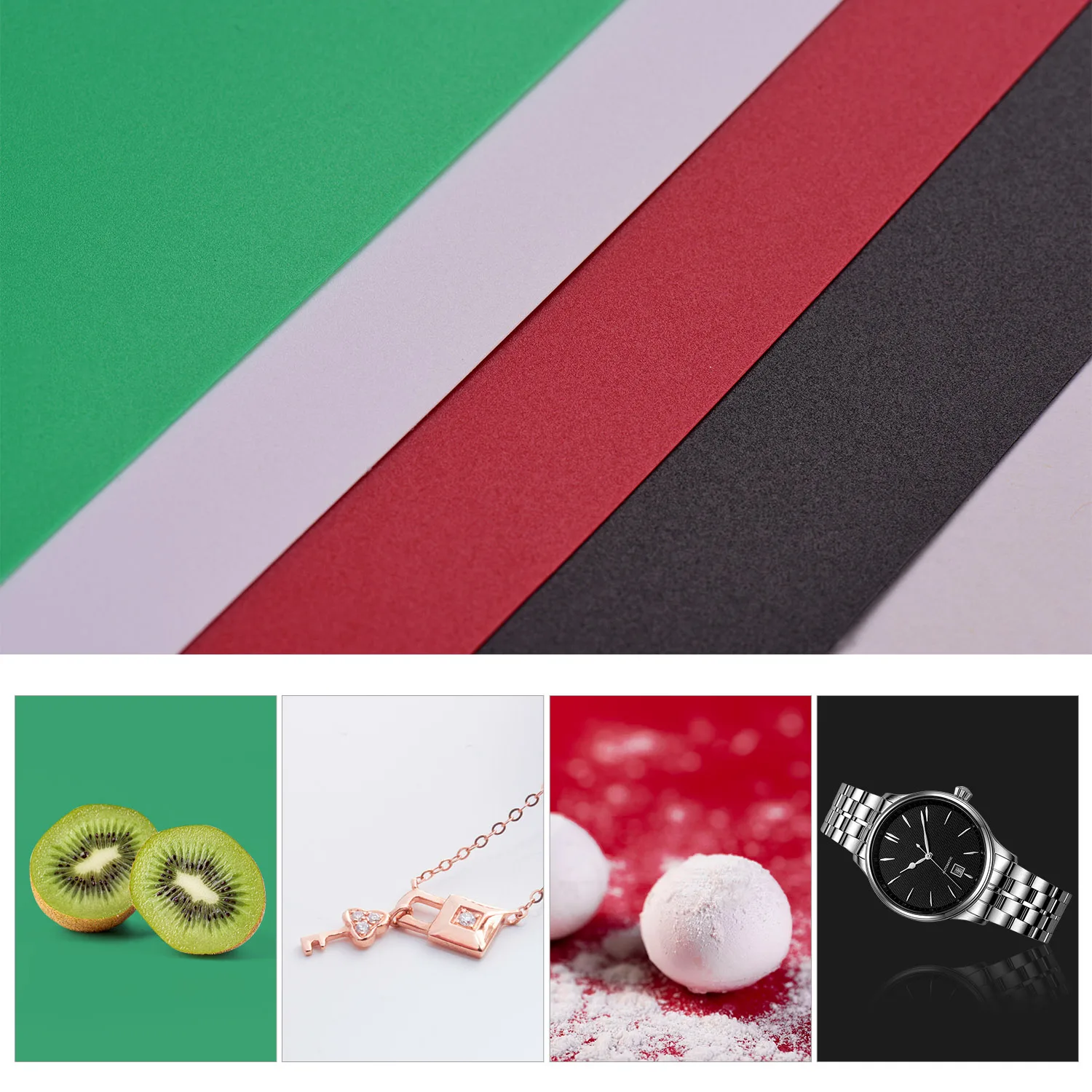 4 цвета фона: белый, зеленый, красный и черный 4 цвета фона включены для более разнообразной съемки, определяемой предметами.