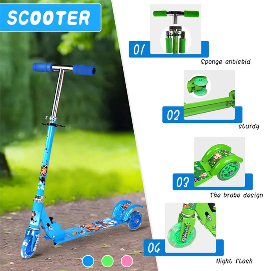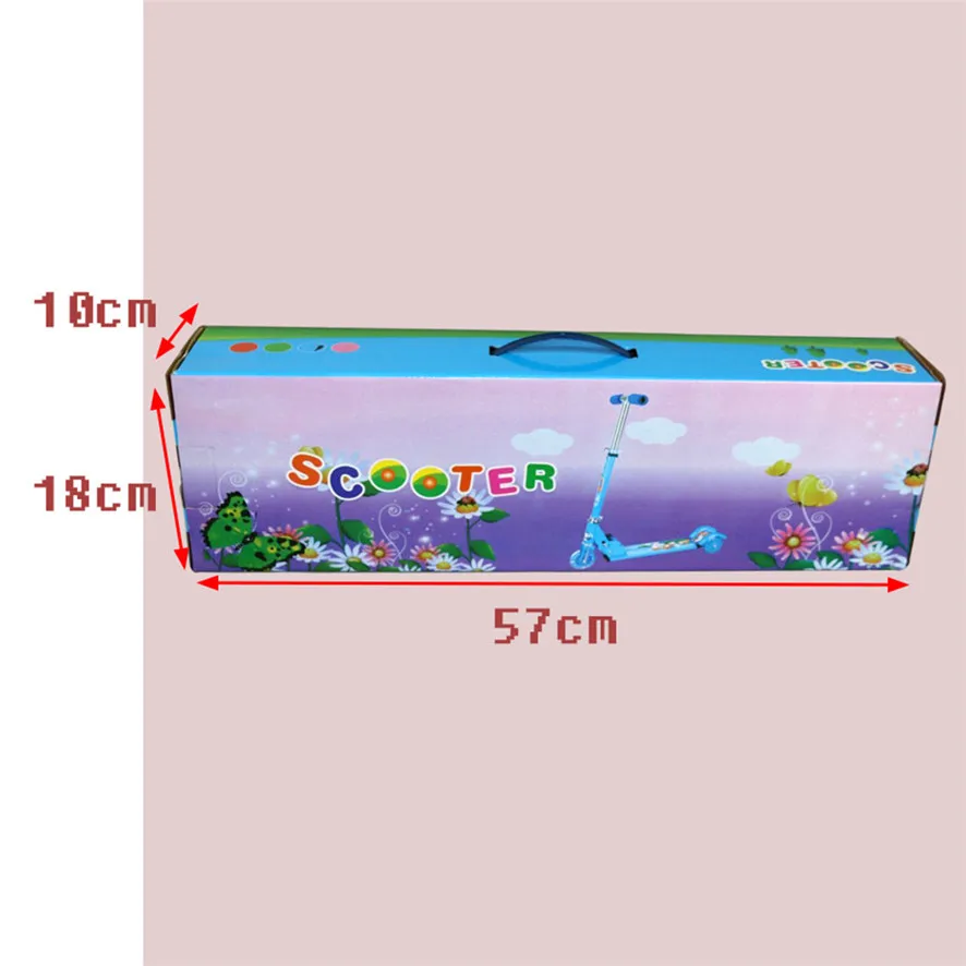 ADJUSTABLE HANDLEBARS: Our kick scooter designs with adjustable handlebar. Adjust the Aluminum Alloy T-bar, the scooter will grow with your child allowing them to enjoy their scooter for longer. adjustable height options 50CM-74CM to accommodate ages 3 to 12 year old, suitable for 33" to 63" height. Handlebar grips provide maximum comfort and will not wear out quickly.PU FLASHING WHEELS: The kids scooters features 1 front LED wheels and 2 small rear wheels, which are bright enough to see during the day and are really nice at night. Our LED Wheels are motion activated with no batteries required, adding an original and fun to the ride, making your scooter unique!TURN AND STOP EASILY: Lean-to-Steer technology and lightweight design offer better control turning and keep balance easily by your child's physical incline. Large aluminum reinforced rear-wheel foot brake is easy to stop the scooter quickly when treads, prevent muddy water from splattering on your kids back legs.COMFORTABLE AND SAFE: The 3 wheel scooter comes equipped with non-slip deck, unique PU high-rebound wheels and ABEC-7 bearings, make the children scooter glide stably, smoothly and quietly. Double rear wheels added stability, provide a safe riding for first time riders.DURABLE AND EXTRA WIDE DECK: The toddler scooter features extra wide deck design, provides more comfortable and better stability, sturdy enough to hold up to 110lbs. The deck is low-to-the-ground, making it easy for little kids to hop on and off. Large enough to place Both Feet on the deck, kids can switch from pushing to enjoy the ride.Size:57x(50-74)cm/22''x(19-29)''The package includes: