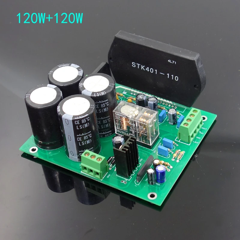 STK401-110, выходная мощность 70 Вт x 2 @ 6 Ом STK401-140, выходная мощность 120WX2 @ 6Ω Рабочее напряжение: 401-110: двойной блок питания переменного тока 20-33 в 401-140: двойной блок питания переменного тока 20-42 в Размер печатной платы: 115x90 мм Плата усилителя поставляется с защитой громкоговорителя UPC1237, защита японского реле Omron. Конфигурационный конденсатор по умолчанию-6800 мкФ/50 в 4 (источник питания в пределах 34 в) или 4700 мкФ/63 в 4 шт.