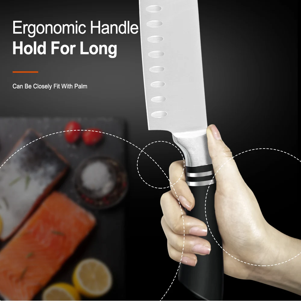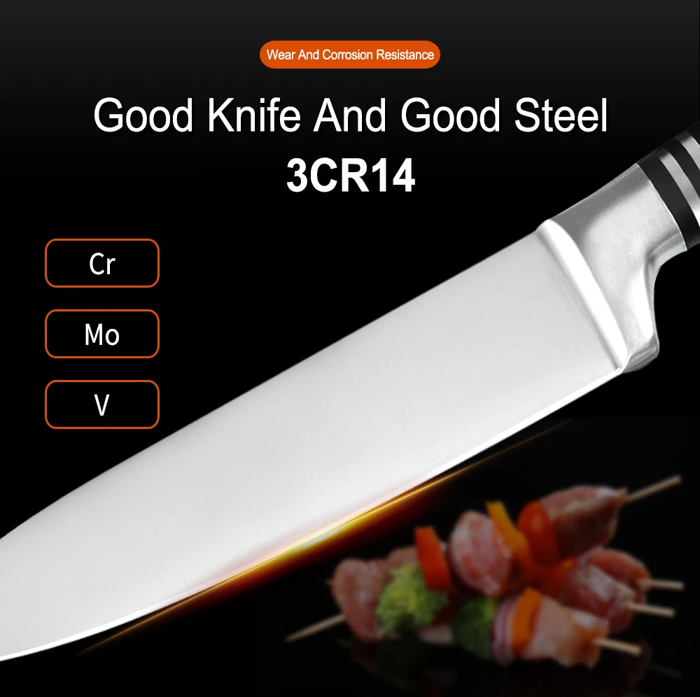 Набор кухонных ножей из нержавеющей стали XYj изготовлен из высококачественной нержавеющей стали, хорошо подходит для измельчения мясных костей, не ржавеет, твердость и долговечность. И ножевой рукояти-нержавеющая сталь АБС-материала, эргономичный дизайн, с антипригарным покрытием, светильник вес, удобная и экономия труда, легко резать, длительный срок службы.