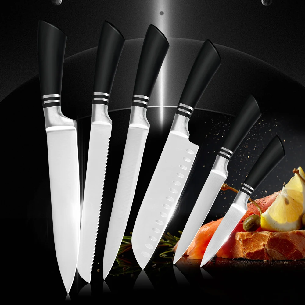 1*8 дюймовый нож шеф-повара 1*8 дюймов нож для нарезки 1*8 дюймовый нож для хлеба 1*7 дюймов нож Santoku Ножи 1*5 дюймов Универсальный Ножи 1*3,5 дюймовый нож для очистки овощей 6 * крышка ножа
