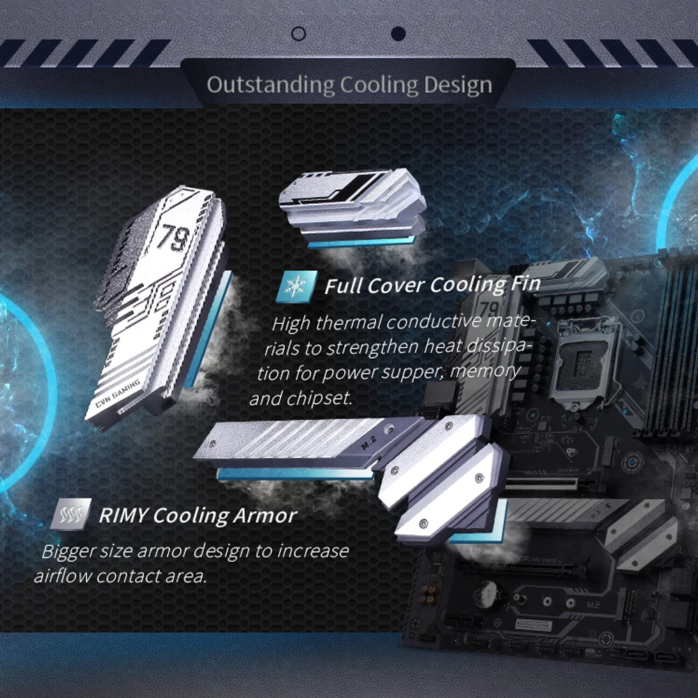 Использование высокотеплопроводного материала для усиления отведения тепла для питания ужина, памяти и чипсета. Броня большего размера предназначена для увеличения площади контакта с воздушным потоком.