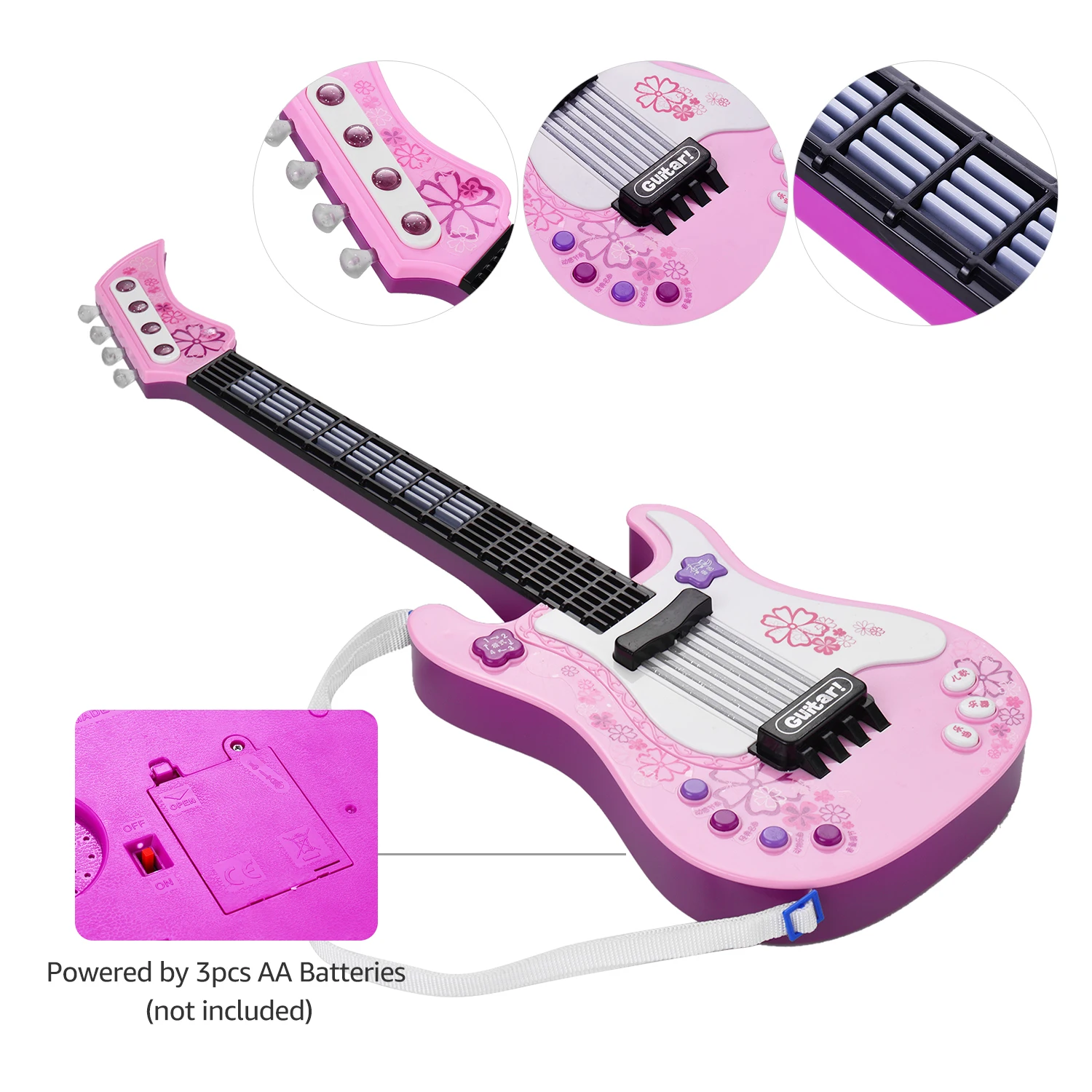 Playing the toy guitar is beneficial to inspire kids' musical talent, exercise the coordination and flexibility of their small hands. Adopting quality ABS plastic, solid and durable, safe for kids using.