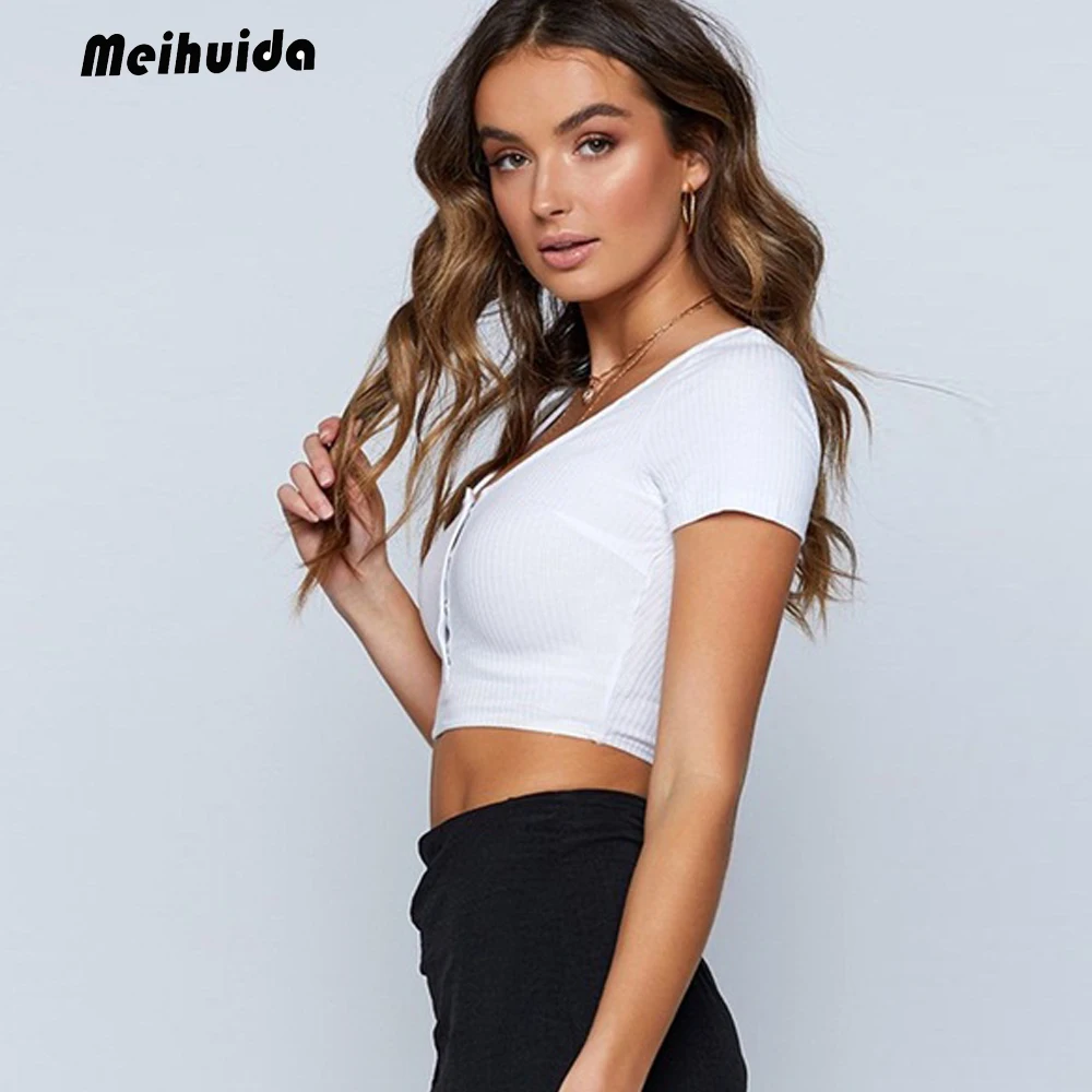 Meihuida женский летний топ с глубоким круглым вырезом и коротким рукавом, укороченный топ на пуговицах, облегающий уличный клуб