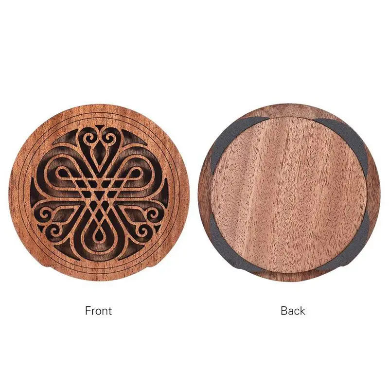 2. Задняя пластина крышки звукового отверстия съемная. С задней панелью крышка звукового отверстия работает как глушитель; Без задней панели Крышка звукового отверстия является хорошим украшением для вашей гитары. Если задняя пластина часто отпадает, когда она работает как глушитель, вы можете использовать небольшую двойную боковую ленту для фиксации.