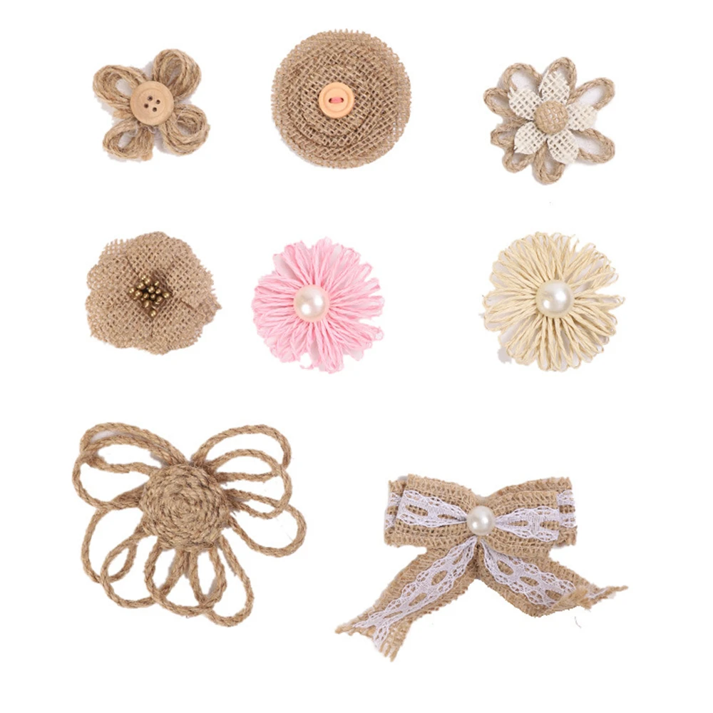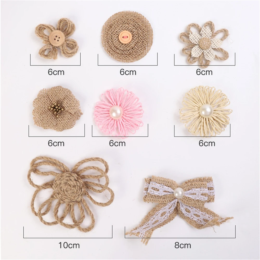 Широкое применение: Мешковина с цветами и бантиками ручной работы и плоская на спине, легко приклеивается, подходит для винтажный головной убор, заколки для волос, шляпы, броши, приглашения в деревенском стиле, поздравительные открытки, подарок, обертывание, скрапбук; Также может быть применен во многих случаях, таких как деревенская свадьба, Рождество, вечерние, домашний декор.