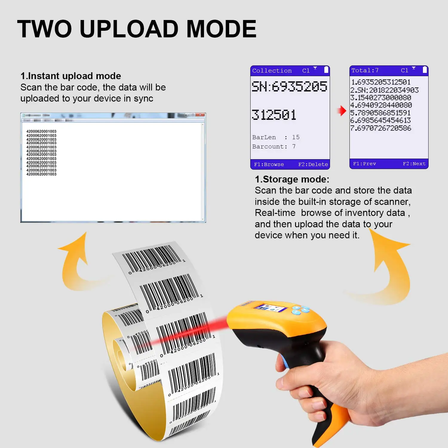 Режим хранения: при использовании сканера далеко от диапазона беспроводного сигнала. Активируйте инвентаризацию или режим сбора, все отсканированные штрих-коды будут храниться непосредственно в bulit-in памяти сканера. Вы можете просматривать данные штрих-кода в реальном времени на экране. И затем Загрузите данные на ваше устройство, когда вам это нужно. Внутренняя автономная память поддерживает до 100000 штрих-кодов.