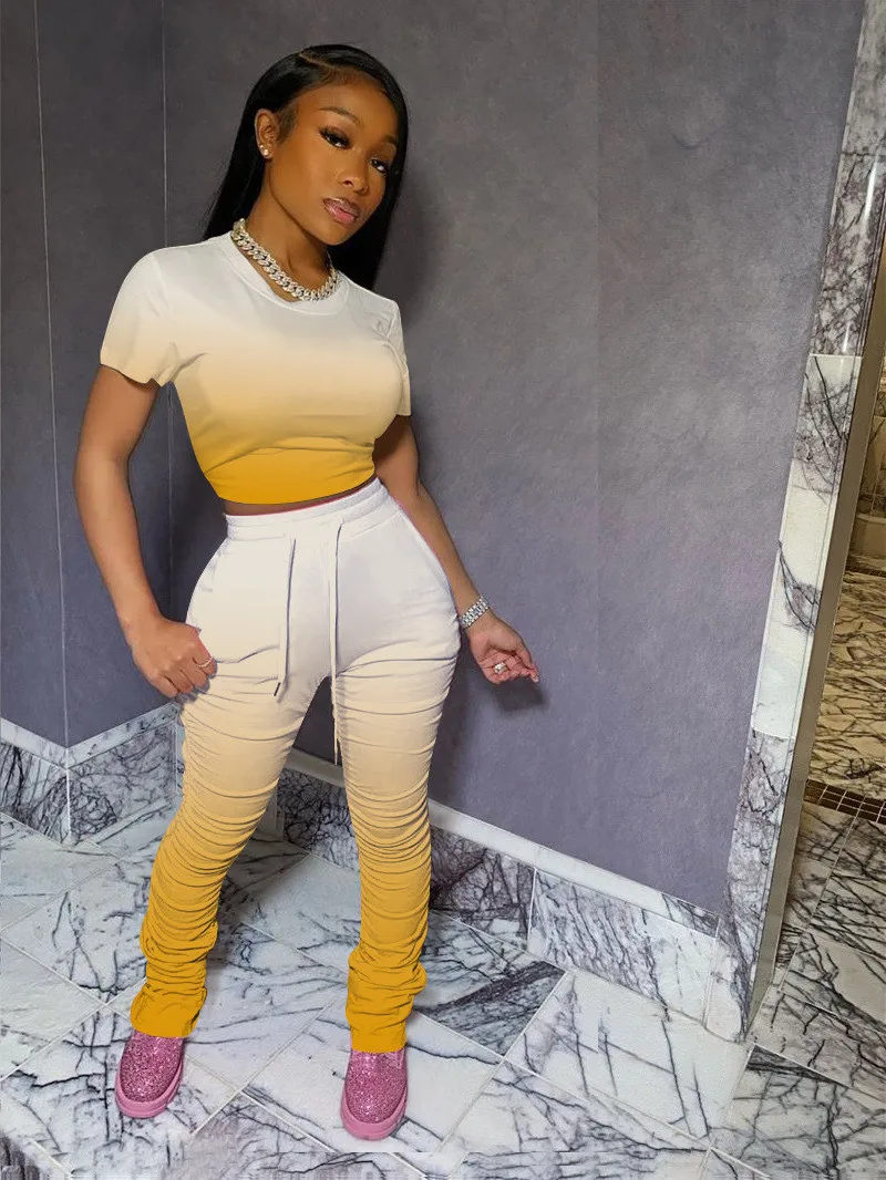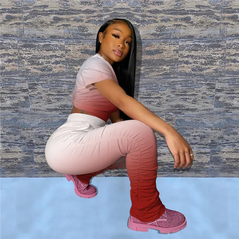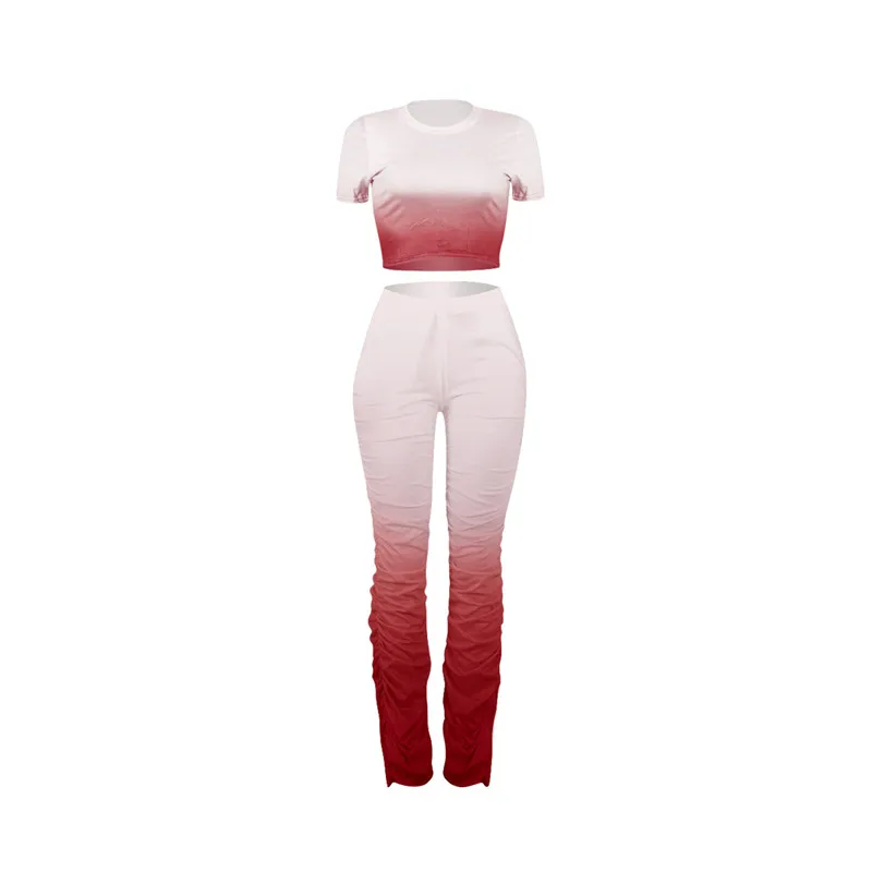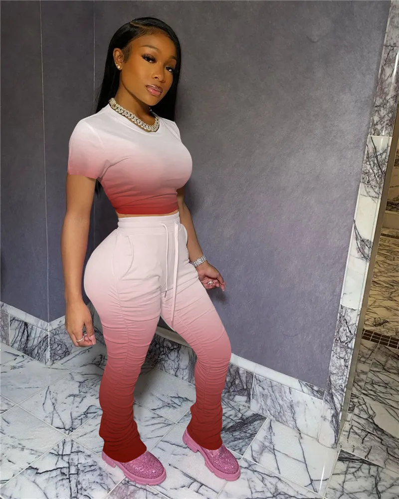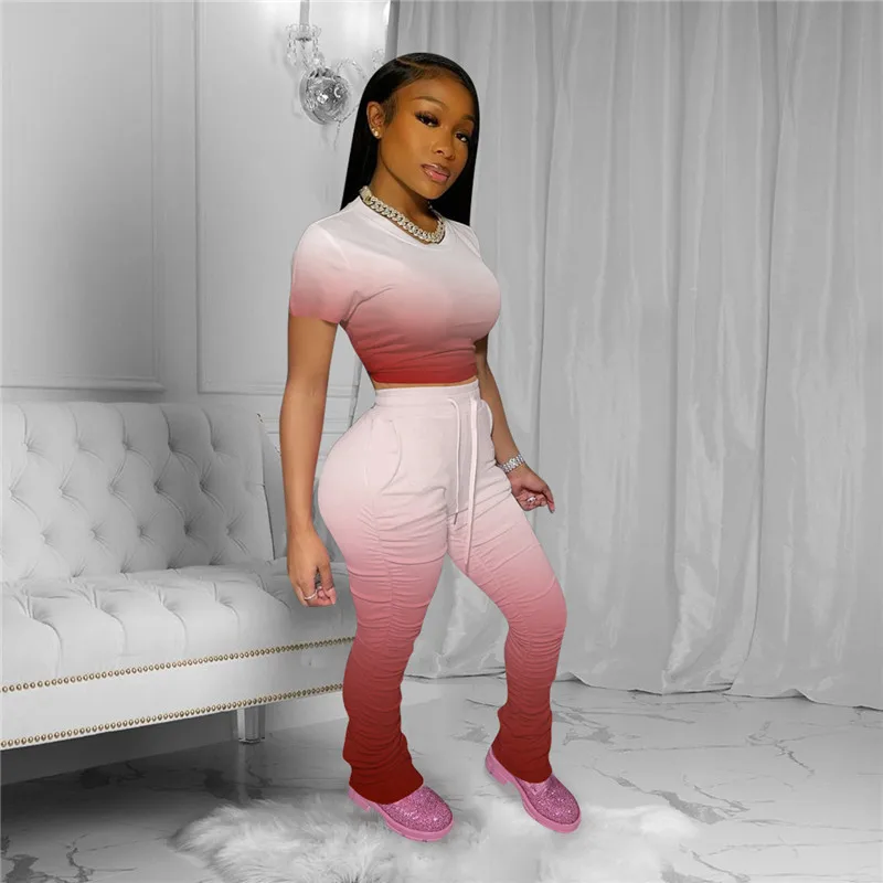2020 Women Flare Pants Stacked Joggers Gradient Print Short Sleeve T-shirts Pleated High Waist Trousers Split Bell Bottoms 2PCS