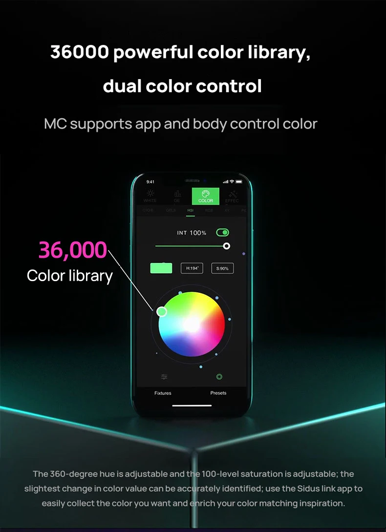 Особенности полного цветового управления HSI и диапазон CCT 3200K-6500K, давая вам полный спектр цветовых вариантов. Это также