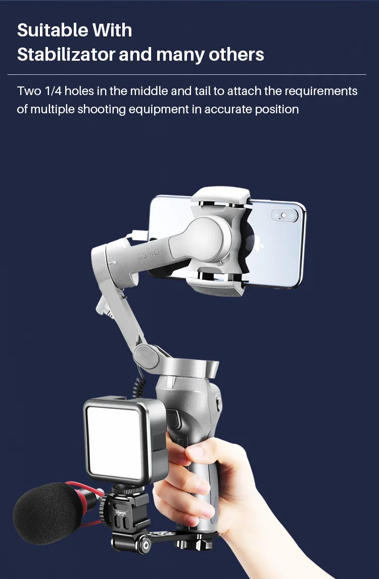 5, можно не только подключить стабилизатор, но и использовать с мобильными телефонами и другой съемкой, кронштейн имеет два отверстия 1/4 в середине и винт 1/4 в хвосте, который соответствует множеству оборудования для съемки и точному позиционированию