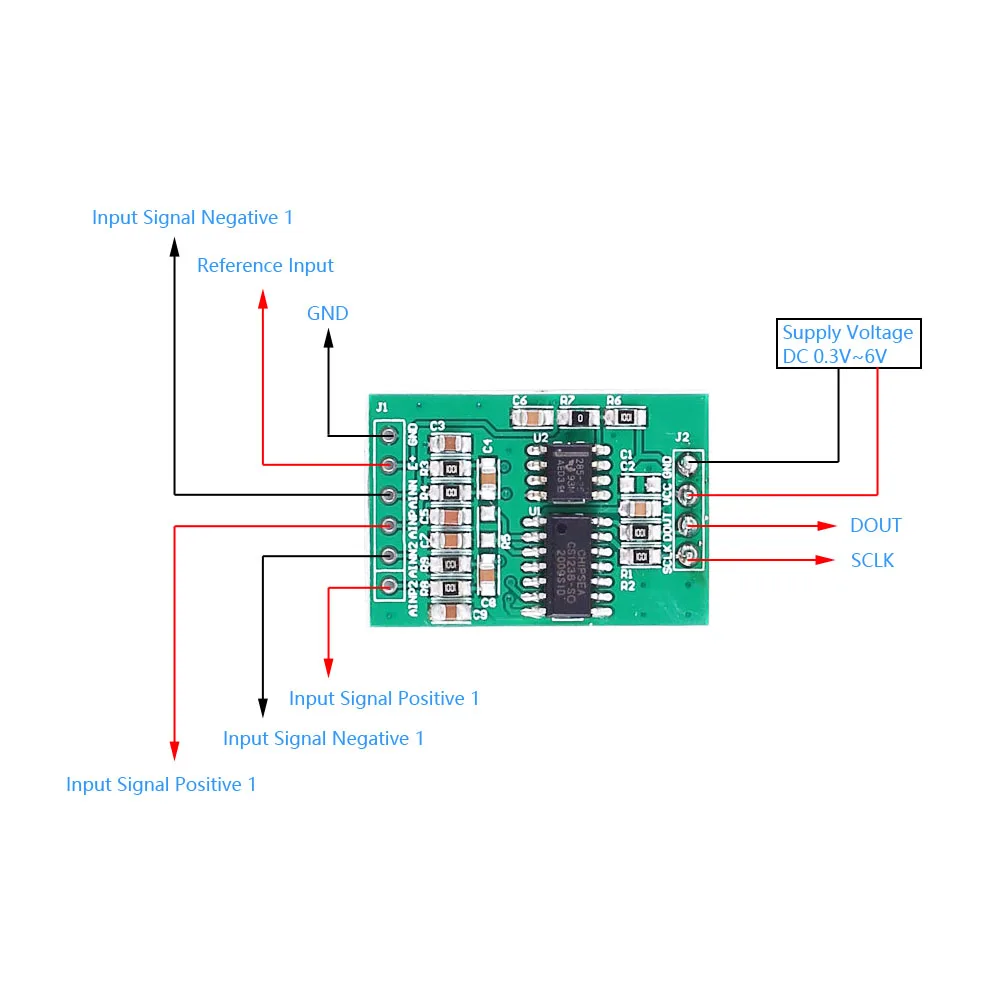 Это 24-битный модуль ADC. Он может непрерывно преобразовывать аналоговые количества в цифровые количества. Он также может измерять отрицательное напряжение. Он имеет чип CS1238, который является высокоточным, низкомощным аналого-цифровым преобразователем, двумя дифференциальными входными каналами, встроенным датчиком температуры и прецизионным осциллятором.