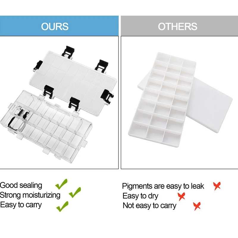 Портативный дизайн: передняя часть коробки с палитрой краски имеет совок для краски, прост в использовании непосредственно; Задняя часть прикреплена с отверстием для большого пальца, чтобы позволить вашей палитре перемещаться. Устойчивый и безопасный.
