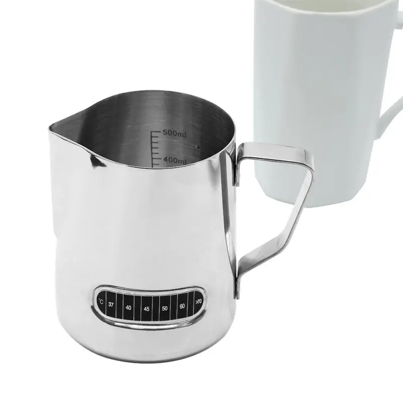 Уникальный дизайн: ручной кувшин для молока предотвращает ожогов; Круглый низ из нержавеющей стали позволяет легко мыть без пятен; благодаря узкому носику, который идеально подходит для заливки, легко отделяет пену от жидкости и для идеального латте.
