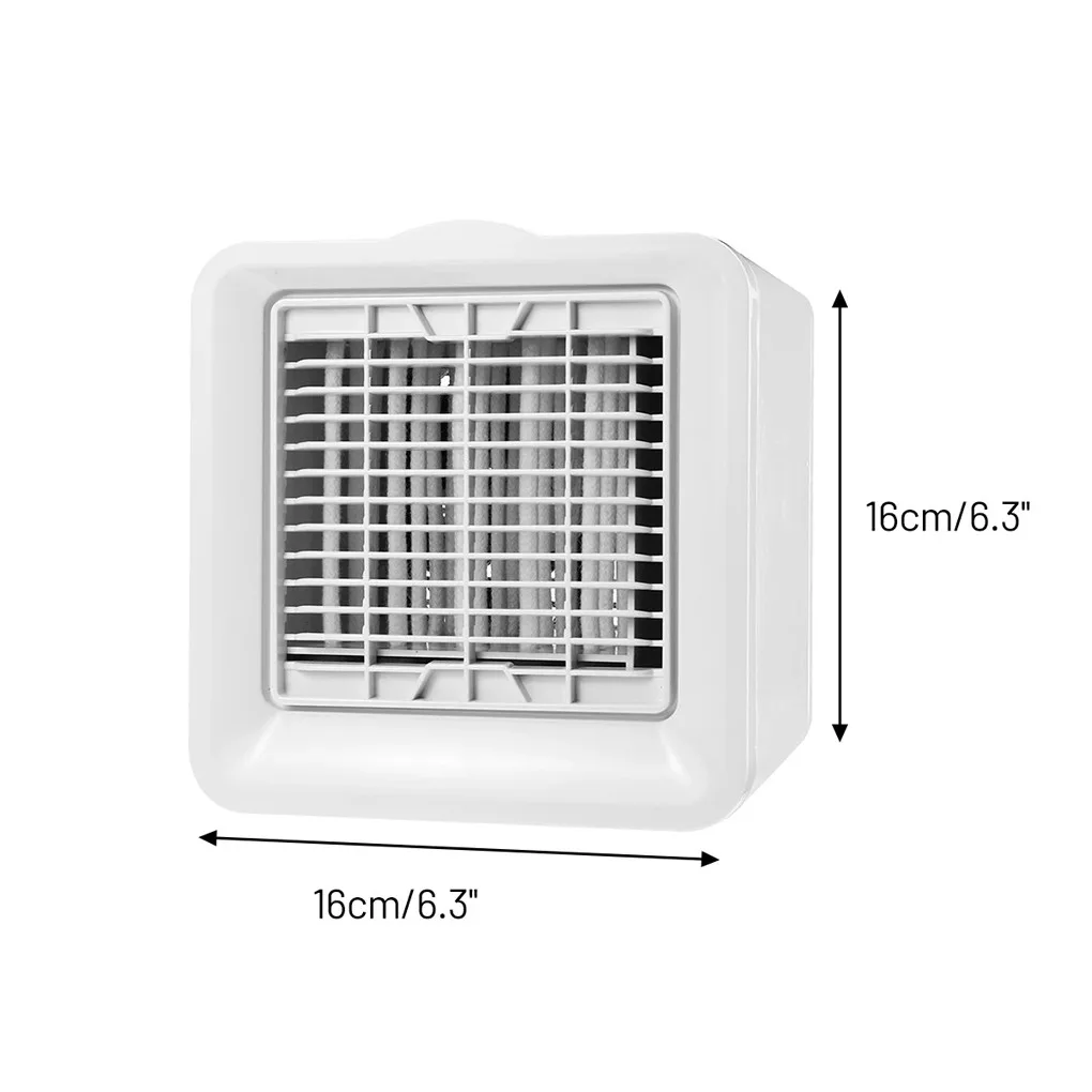 MULTI-FUNCTION AIR COOLER : An all in one combination of cooling air conditioner, desk fan, and air humidifier. The latest evaporative cooling technology, draw in hot air and pass it through a wet filter, which then exits the other side as cool, refreshing air. No water automatically stops the atomization work ,Wind direction can be adjusted for convenience. With the latest atomization evaporator cooling technology, you can enjoy the mist while keeping yourself away from dry air. FAST COOLING DOWN : Fast cooling down the hot air around you. With 3 fan speeds, you could select the perfect wind power as you need. This air Personal space conditioner pulls warm air from the ro-om through its evaporative water filter to create your personal space with both humidified and cool air, allows you to add essential oil, ice or ice water into the tank to accelerate the cooling speed. PORTABLE& POWER-SAVING : We designed specifically this lightweight air conditioner fan for individual use. 6.8x 5.9x6.8 inch is easy to carry and not taking up space space, great for bedroom, office, dorm, trip, etc. Small and compact, portable handle, convenient and labor-saving, anytime, anywhere, experience the coolness everywhere ,Enjoy the coolness and no longer have to worry about the electricity bills. Just a few cents a day. ENERGY EFFICIENT & NO-FREON : Low Energy Consumption same as the power consumption of a light bulb,uses no freon, much cheaper than running a freon air conditioner in Hot Summer Days. No blades exposed no possibility to hurt people and totally safe for using by kids or pets.Accompany your child better and more at ease. LOW DB : Advanced motor produces powerful but quiet airflow, doesn't disturb sleep, study, work . NOTICE: This portable air conditioner only cools the area around the user.Specification:
