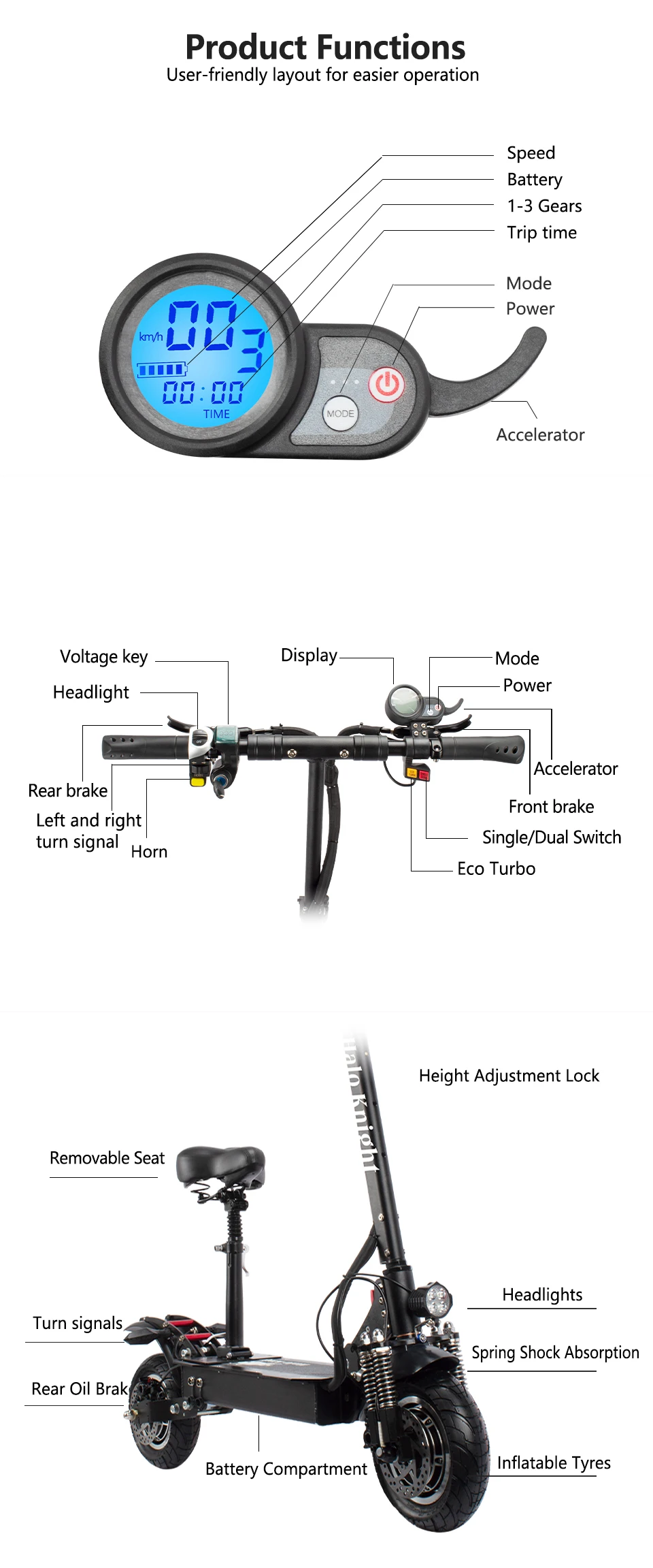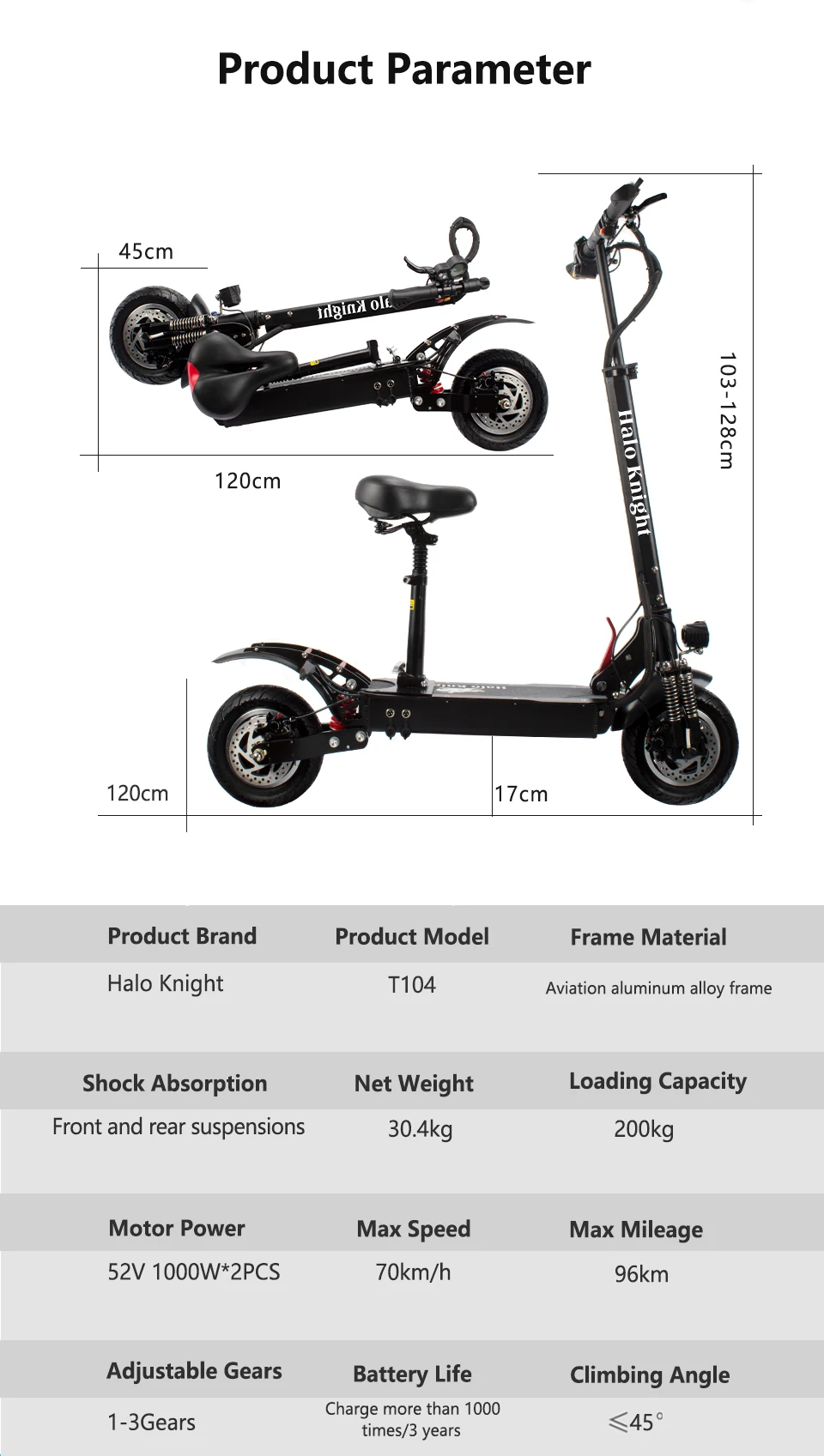 Европейский запас Halo Knight T104 электрический скутер 52 в 2000 Вт 70 км/ч с гидравлическим тормозом двойной привод Электрический мотоцикл поворотники FQA 1. Вопрос: Какой продукт подчеркивает Halo Knight T104? A: T104-это двойной привод 52 в, с мотором HM 52V 1000W, контроллером JP 25A, батареей 18650 23,4ah, батареей 21700 28.8Ah/38.4Ah, передняя и задняя амортизация, головной светильник, задний тормозной светильник и поворотники. 2. В: какой тормоз используется T104? О: передний и задний гидравлический тормоз с EABS. 3. В: какая шина используется T104? A: 10 дюймовые дорожные надувные шины TUOVT. 4. В: Какова производительность T104? О: скорость может достигать 70 км/ч, работать около 96 км за одну зарядку. 5. Вопрос: Должен ли клиент платить дополнительные налоги или пошлины на скутеры? О: клиентам не нужно платить дополнительные налоги или пошлины, потому что налоги были оплачены на нашей стороне. 6. Вопрос: Сколько времени прибудет скутер? О: если заказ из Китая, займет около 32-42 дней на поезде или по морю. При заказе со склада ЕС, доставка клиентов займет около 3-7 рабочих дней. 7. В: Могу ли я получить все запасные части T104 в магазине? О: Да, мы являемся прямым производителем, все запасные части наших скутеров доступны, даже маленькие винты. 8. В: Могу ли я быть вашим дистрибьютором или могу ли я сделать OEM/ODM, чтобы настроить скутеры с моим логотипом? О: Конечно, мы специализируемся на 8-11 дюймовых скутерах более 8 лет, доступны OEM/ODM, добро пожаловать в один из наших дистрибьюторов. 9. Вопрос: Есть ли гарантия на ваши скутеры? О: Да, гарантия 6 месяцев на батарею, 12 месяцев на другие запасные части. Если скутеры повреждены во время транспортировки или имеют проблемы после прибытия, Бесплатные аксессуары будут отправлены из Китая, и груз будет на стороне продавца. Если запасные части сломаны в течение 12 месяцев или батарея сломана в течение 6 месяцев, Бесплатные аксессуары будут отправлены из Китая, и доставка будет на стороне клиентов. Нанесенный человеком ущерб и вода не покрываются гарантией. Как правило, наши скутеры будут в порядке в течение одного года, потому что будут строгие проверки качества, чтобы убедиться, что каждый скутер идеален перед отправкой. 10. Вопрос: Есть ли скидка на покупку T104 сейчас? Ответ: Да, скидка 50% и купоны для T104 сейчас. Если вы заинтересованы, просто возьмите его.