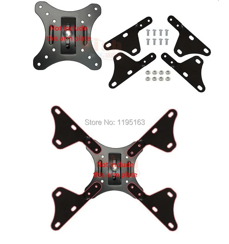 Model No.: X200 Material: cold rolling iron Applicable for VESA size: 50*50mm/ 75*75mm/ 100*100mm Extend to VESA size: 150x100mm/ 150x150mm/ 200x150mm/ 200x200mm Package includes: 4pcs mounting extension panels+ 8 screws + 8 screw nuts Attention: The picture is only for demonstration, the listed price only includes the extension board, not include the bracket panel!