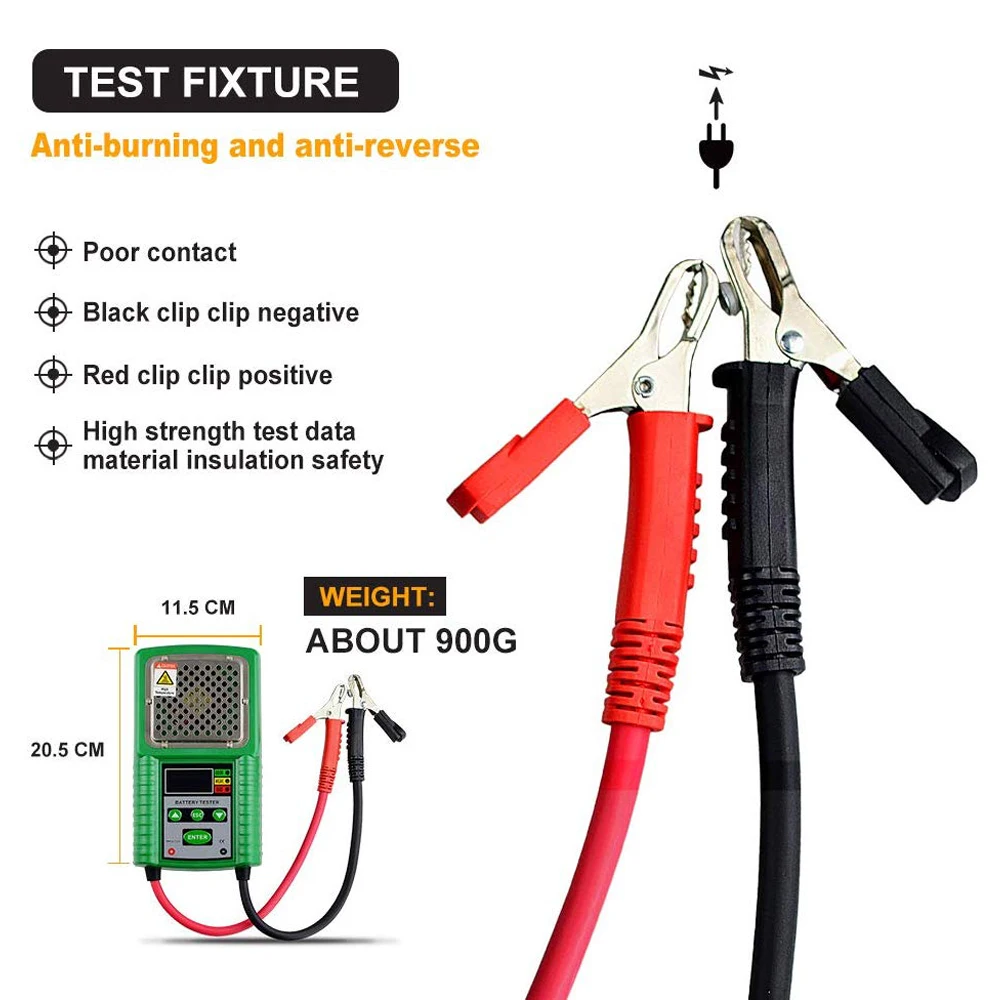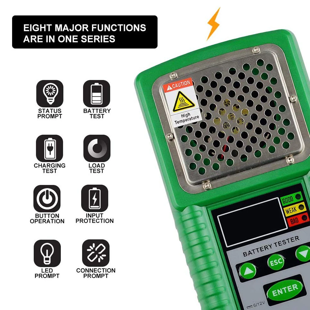 1) используется на обычных 6 В, 12 В тяговых свинцово-кислотных батареях. 2) тестовый ток нагрузки: < 80A. 3) Диапазон тестирования емкости батареи: 40Ah-200Ah. 4) максимальное значение напряжения: DC19.99V. 5) внутреннее сопротивление батареи: 1,00 миллиом-99,99 миллиом. 6) Светодиодный светильник с индикацией состояния: состояние батареи: «зеленый» (достаточный аккумулятор), «желтый» (низкий аккумулятор), «Красный» (Замена аккумулятора); 7) Предустановленная Емкость батареи: 40 - 200 A h непрерывная регулировка, 5 A h приращение. 8) Время тестирования: менее 10 с; Интервал тестирования: примерно каждые 5 минут.