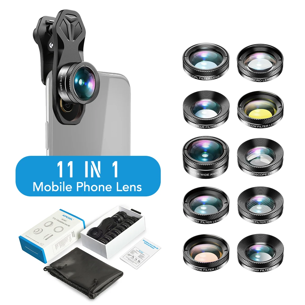 Объектив камеры телефона 11в1 комплект:Этот идеальный комплект для объектива камеры телефона включает в себя макрообъектив, широкоугольный объектив 140 °, фильтр ND32, линза калейдоскопа, фильтр CPL, Звездный фильтр, объектив рыбий глаз 205 °, цветные фильтры 2 град (синий, серый), 2 полноцветных фильтра (желтый, оранжевый) для вашей повседневной фотографии и делает вашу фотографию более креативной.