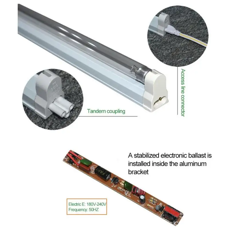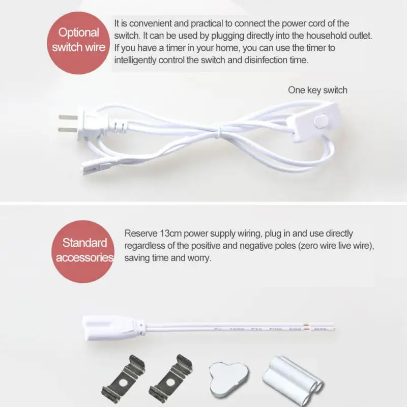 Аксессуары продукта: лампа для стерилизации * 1, электропроводка (13 см) * 1, крышка * 1, блок последовательного соединения * 1, монтажный кронштейн * 2