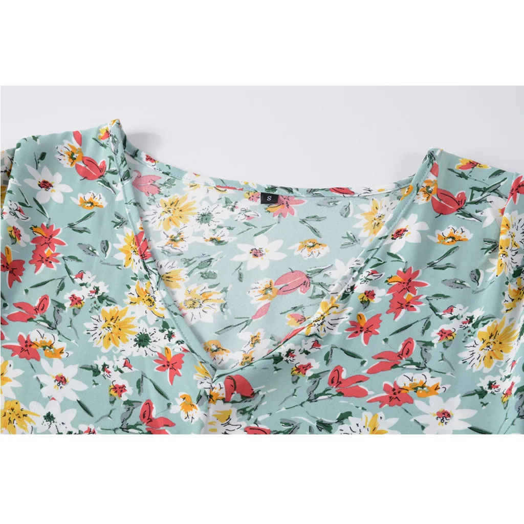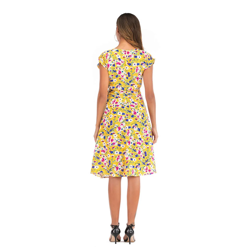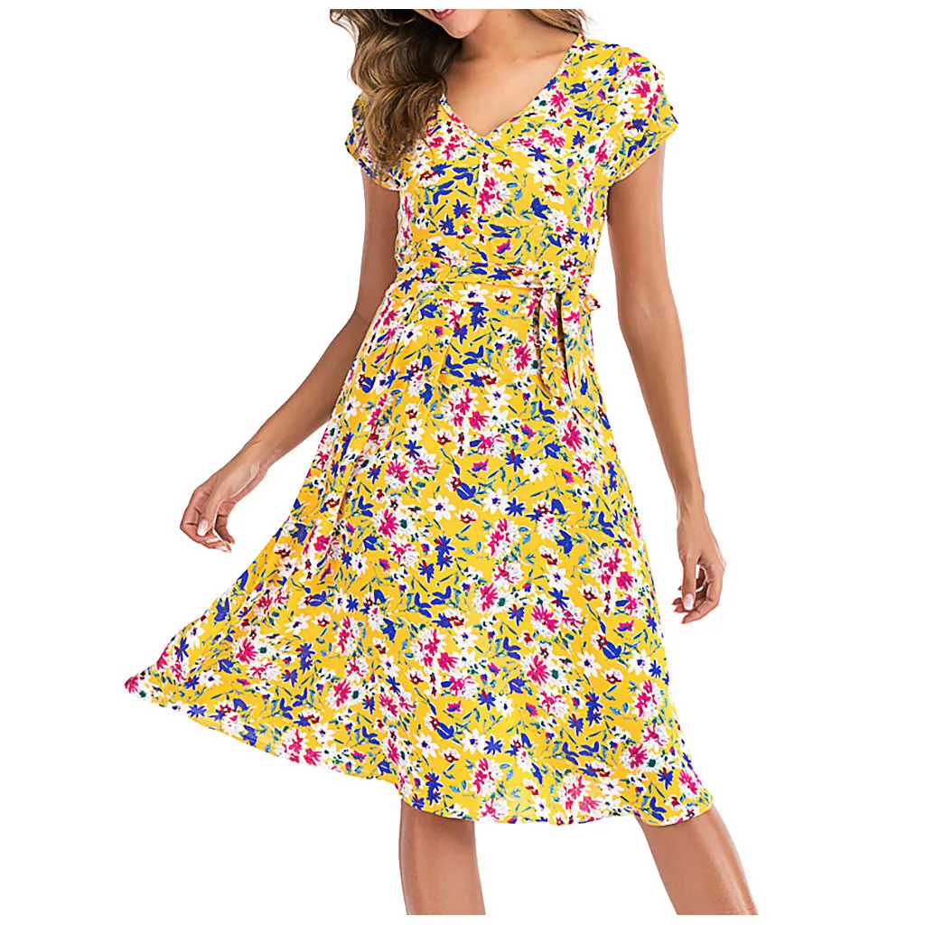 Женские Цветочные Повседневные платья с коротким рукавом, летнее пляжное платье с поясом