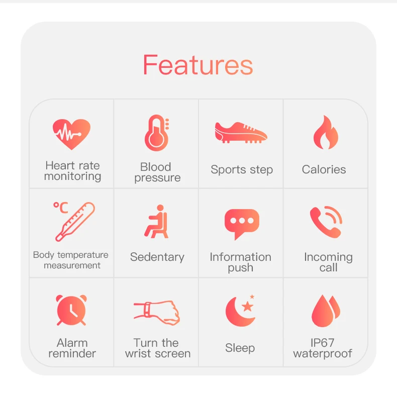 Спецификация Бренд Bakeey Модель T98 Чип RTK8762 Версия Bluetooth BT 5,0 Совместимость с ОС Android 4,4 или выше, iOS 8,2 или выше Полный сенсорный экран с режимом работы Название приложения FitCloudPro Язык приложения Русский, венгерский, греческий, немецкий, итальянский, чешский, словацкий, японский, французский, польский, персидский, тайский, шведский, упрощенный китайский, традиционный китайский, финский, английский, голландский, португальский, испанский, арабский, корейский Особенности Водонепроницаемый IP67 водонепроницаемый Поддержка контроля температуры Поддержка пульсометра Поддержка монитора артериального давления Поддержка мониторинга уровня кислорода в крови Поддержка количества шагов Поддержка нескольких спортивных режимов Поддержка шагомера Поддержка напоминаний о звонках или сообщениях Поддержка отклонения вызова Отображение идентификатора вызова Поддержка Вибрация типа предупреждения Автоматический светильник-Экран Поддержка Поддержка секундомера Дополнительные функции: будильник, календарь, напоминание о необходимости двигательной активности, дистанционное управление камерой, защита от потери, управление музыкой Советы: 1. Отображение и светильник съемки могут повлиять на цвет товаров. Изображения представлены только для справки в зависимости от наличия товаров. 2. Пожалуйста, загрузите приложение перед использованием, чтобы обеспечить идеальную совместимость с вашим телефоном.