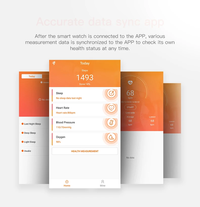 После того, как смарт-часы подключены к приложению, различные данные измерений синхронизируются с приложением, чтобы проверить его состояние здоровья в любое время.