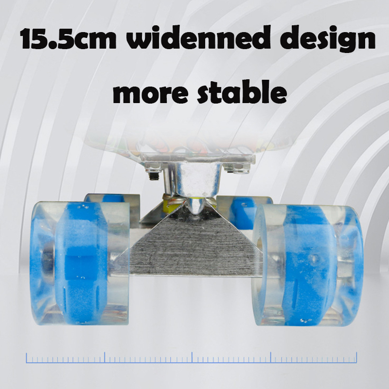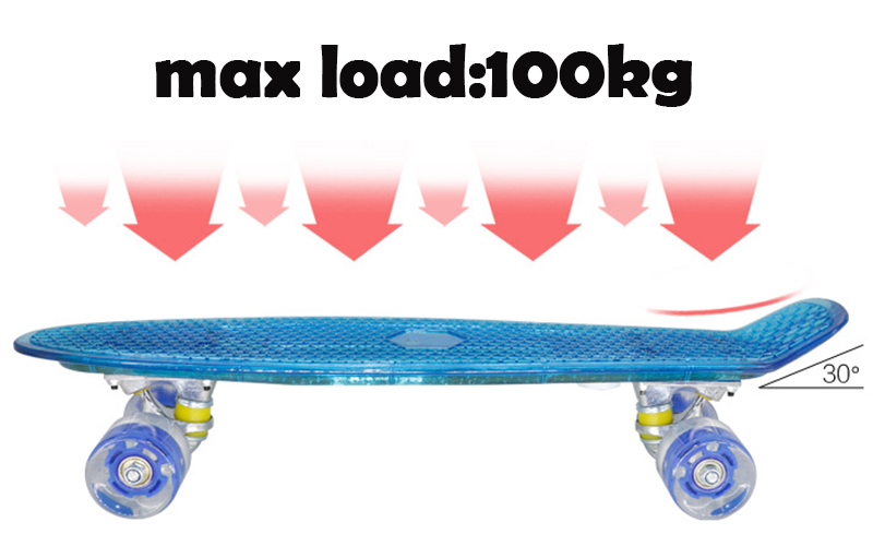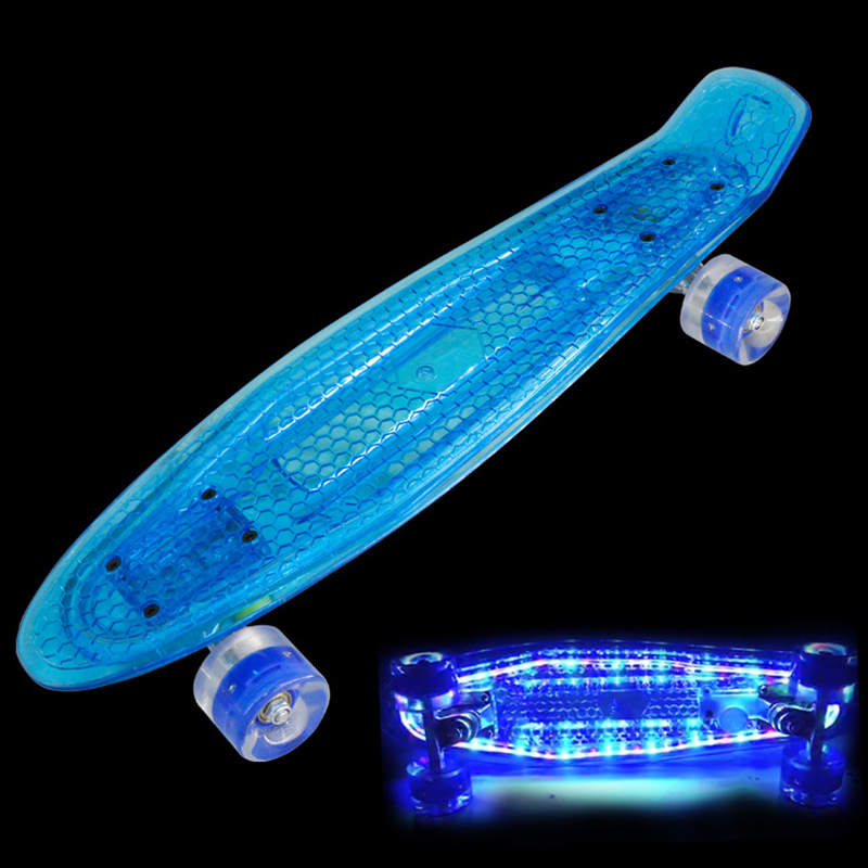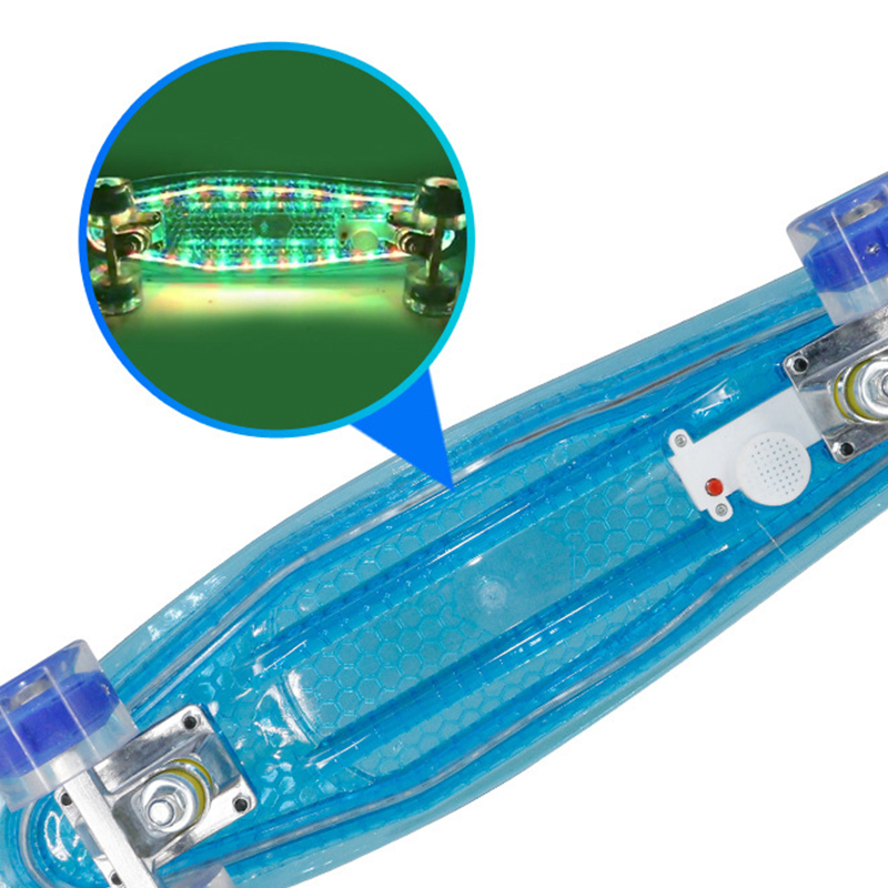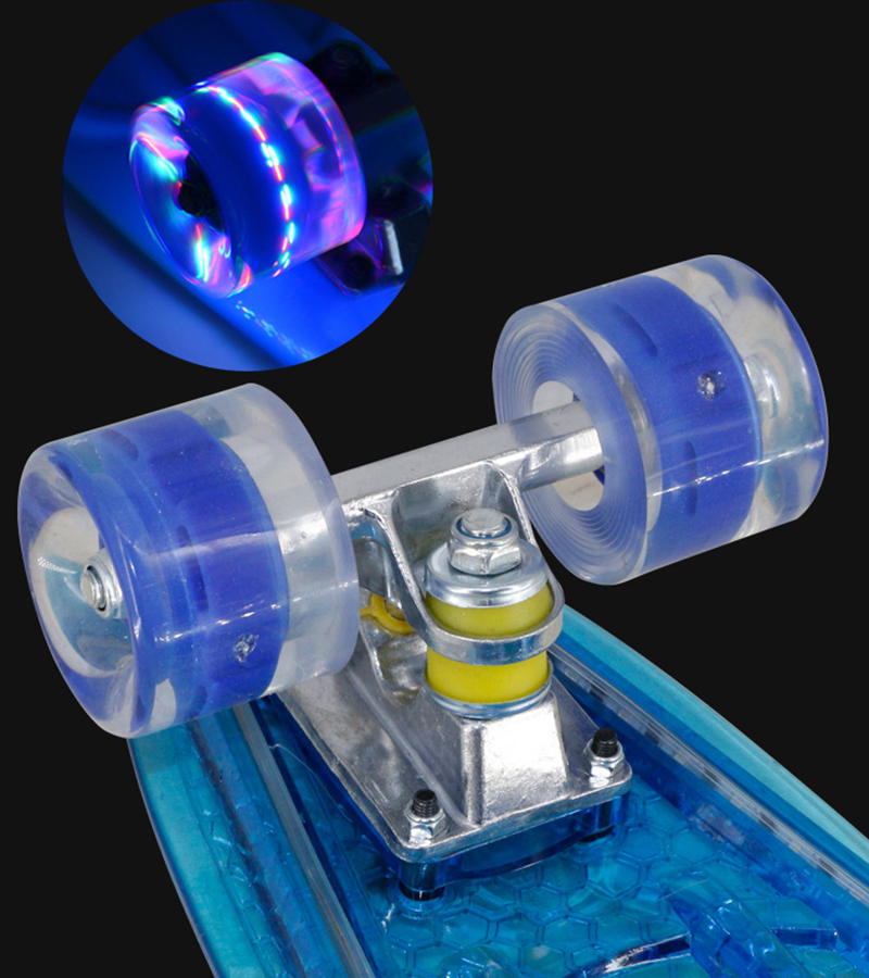 Упаковка: 1 шт. скейтборд (светодиодная прозрачная палуба, PU falsh колеса, грузовики, подшипники)