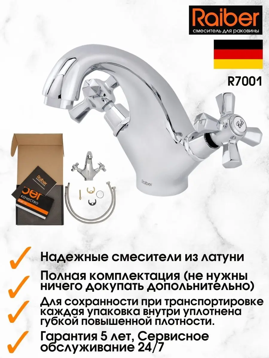 Смеситель для раковины от известного немецкого бренда Raiber, произведен в Китае по немецким технологиям, на немецком оборудовании. Качество сборки контролируется на всех этапах производства. Преимущества: материал – латунь прочный и экологичный, хромированное покрытие гарантирует стойкость к стиранию и зеркальный блеск. В комплекте всё необходимое: смеситель (1шт), гибкая подводка 60см (2шт), монтажный набор, фирменный пакет + коробка.