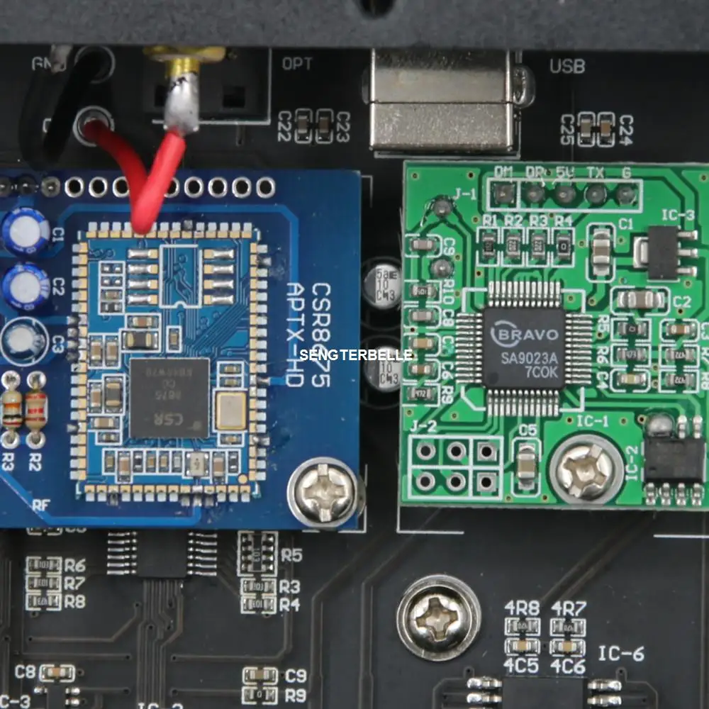 Эта машина имеет 4 цифровых переключателя входного сигнала: USB, коаксиальный, оптическое волокно, Bluetooth. Эта машина имеет 2 стерео RCA несбалансированные выходы: нормальный выход, трубчатая буферная выход. Удобно сочетать ламповый усилитель или Интегрированный усилитель для получения различных эффектов. Основная усилительная доска принимает двусторонний дизайн платы, черный высококлассный припой сопротивляется. Цифровой прием и цифровое-аналоговое преобразование используют известный CS8416 CIRRUS и PCM1794A TI. Выходная часть электронной трубки этой машины имеет средне-частотную и теплую вакуумную трубку 6N3 с мягким тоном, высоким напряжением и нитью постоянного тока. Питание от трансформатора типа R с превосходной производительностью, высокой эффективностью и низкой магнитной утечкой. Цифровая часть и аналоговая часть самостоятельно выпрямляются, фильтруются и стабилизируются для источника питания для уменьшения помех. Функции этой машины контролируются MCU, и состояние канала и уровень громкости, когда машина была в последний раз выключена. Электронный громкость принимает чип CS3310, электронный громкость высокого уровня, хорошую синхронизацию, длительный срок службы, отсутствие шума. В усилителе наушников используется чип TPA6120.