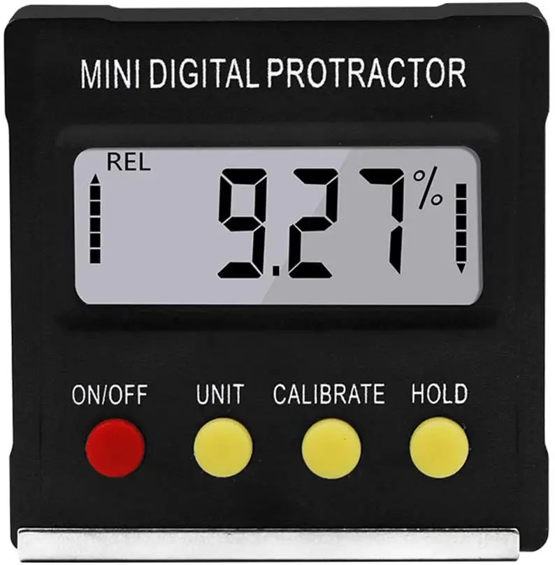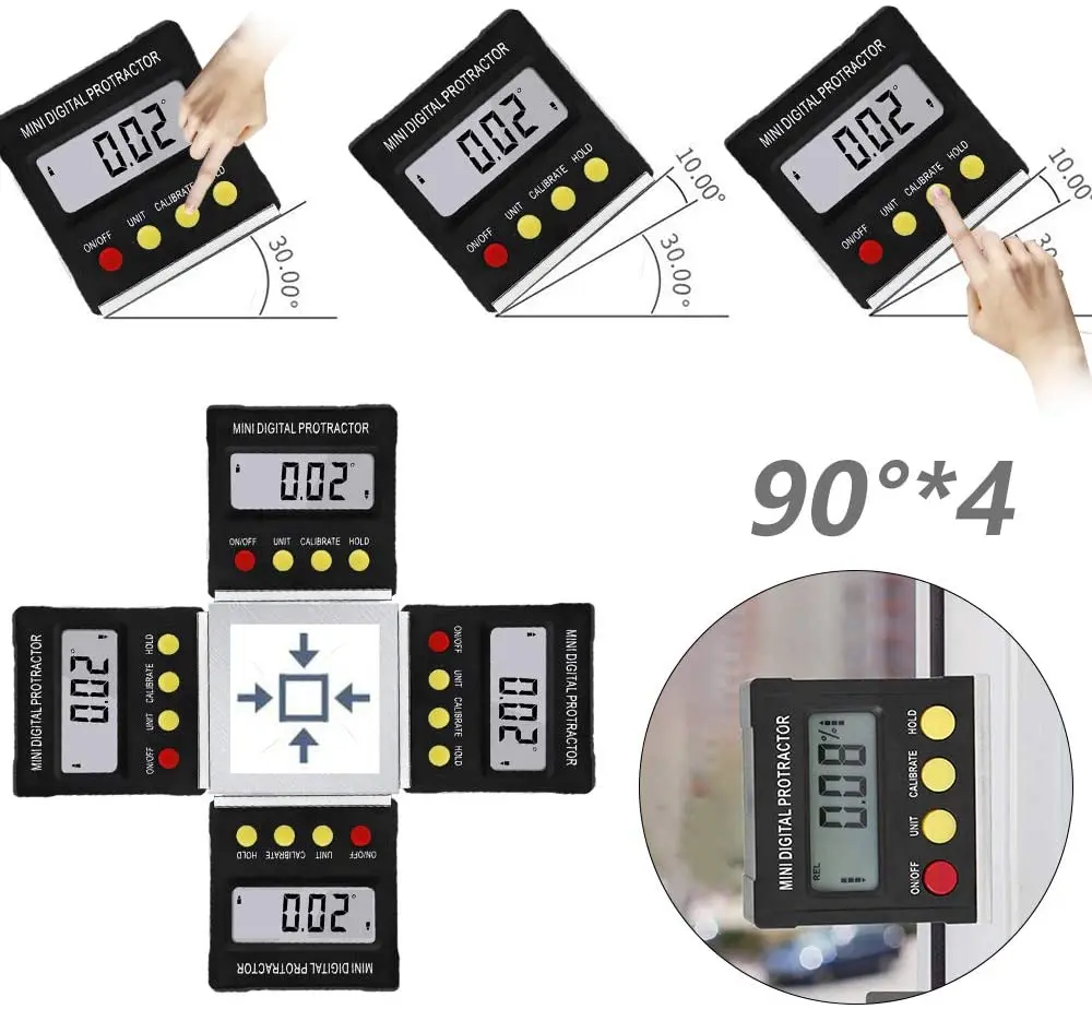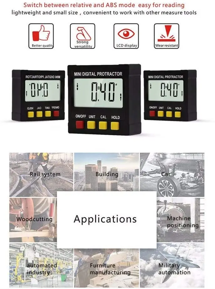 Особенности: ✔Угловой искатель является высоконадежным и многофункциональным инструментом, который сочетает в себе все наиболее востребованные особенности этого стилевого инклинометра, очень подходит для профессиональных и хоббитных деревянных работников, шкафчиков, сварщиков, производители и техники по установке. Таким образом, квалифицированный Цифровой Угол guuge Инклинометр может обеспечить вам точные измерения с большой легкостью. ✔По сравнению с другими инклинометрами транспортира уровня, заключается в его точности и портативности. Уклономер имеет Рабочий диапазон 4x90 °, и его точность определения его местонахождения составляет ± 0,1 градусов, чтобы установить или проверить относительной углы между поверхностями. ✔Цифровой угловой искатель позволяет считывать и удерживать значения при перемещении в новое положение. Благодаря скрытой магнитной базе, она позволяет избежать эффекта поглощаемой металлической пыли для оптимальной точности. ✔Кроме того, Инклинометр занимает небольшое пространство и легкий, портативный, что позволяет взять его в любом месте и начать измерение угла. ✔Кроме того, Инклинометр изготовлен из легкой эксплуатации и долговечен. Большой ЖК-дисплей значительно улучшает видимость и удобство использования в условиях низкого уровня светильник. И дизайн четырех функциональных кнопок, включая вкл/выкл, блок, калибровку и удержание, делает его простым для вас. При отсутствии операции через 3 минуты Инклинометр автоматически выключается. Широкое применение 1. Украшение дома: Регулировка угла пилы, установка уровня измерения. 2. Строительство: угол наклона оборудования, определение наклона дорожного моста; Углы дренажа и откосы. 3. Ремонт автомобиля: позиционирование колеса, выравнивание транспортного средства; Выравнивание работы грейдера и трактора. 4. Производство оборудования: уровень стола станка и регулировка положения наклона; Настройка угла лезвия циркулярных пил; Настройка угла работы для фрезерования. 5. Другие: железная дорога, водное хозяйство, мониторинг платформы, медицина и т. д.