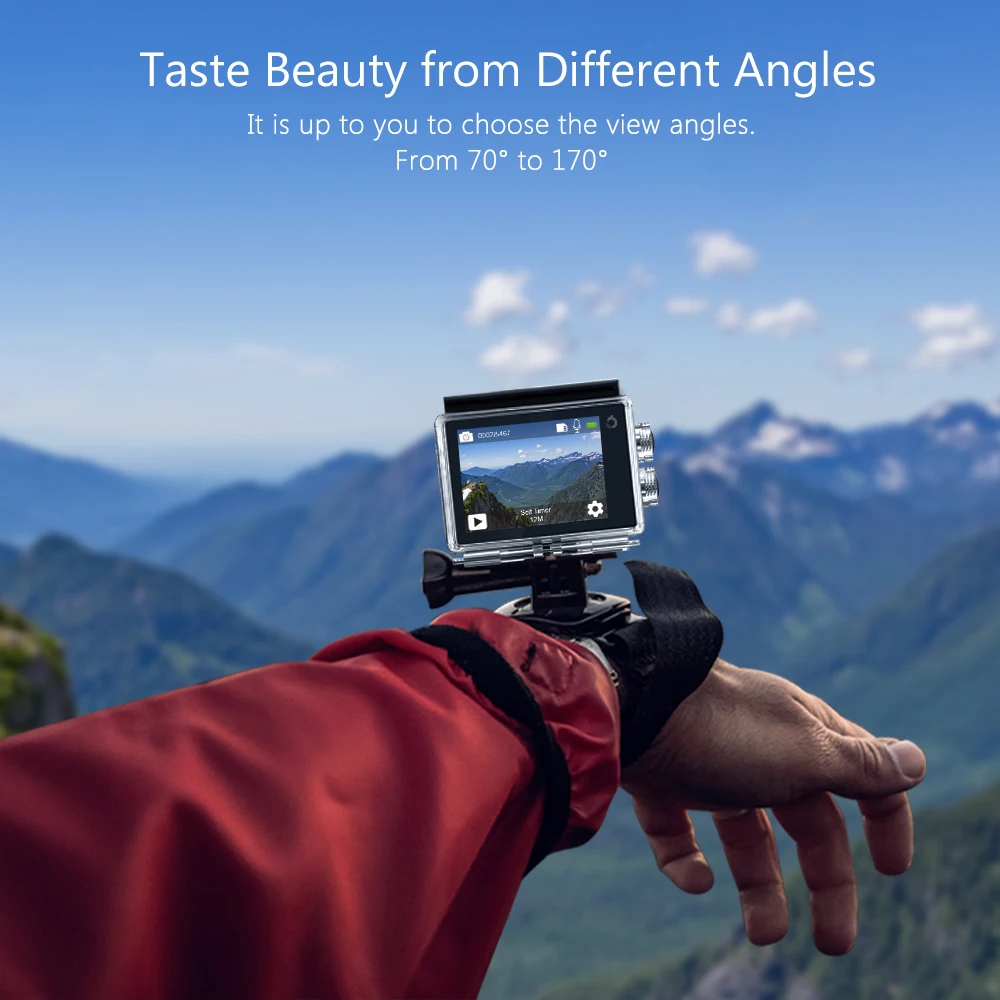 Угол обзора этой экшн-камеры может быть установлен на 170 °,140 °,110 °,70 °. Он установлен на 170 ° в качестве стандарта. Это зависит от вас, чтобы выбрать различные углы.
