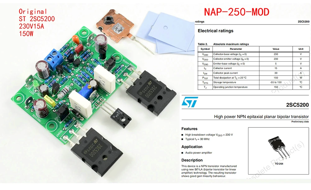 ● На выходном этапе используется импортный ST-2SC5200 230V15A,150 Вт.