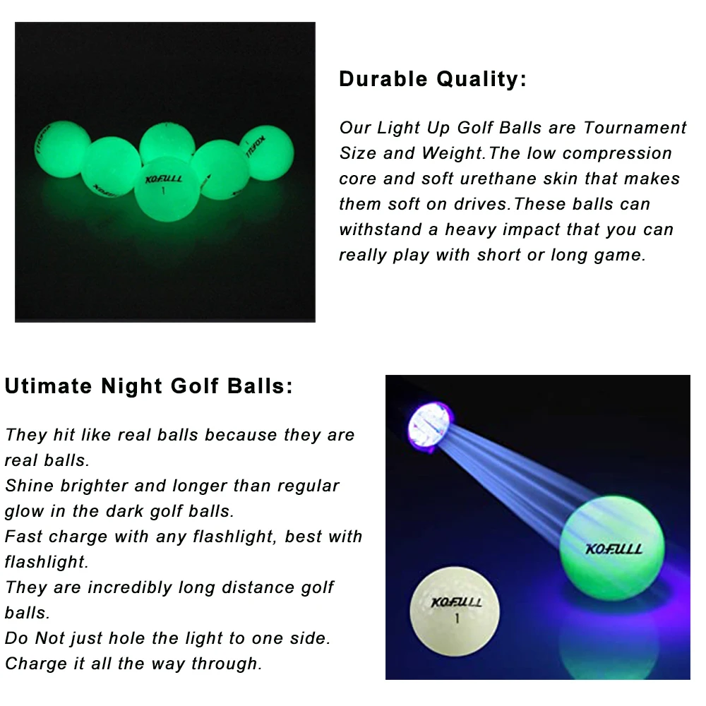 Улучшите ночной опыт игры в гольф:* Вы очень заняты? Не могу сделать время для гольфа? К счастью, когда светящийся мячик для гольфа KOFULL загорится ночью, вы, несомненно, снова почувствуете удовольствие от игры в гольф.* Потому что они имеют двойной слой фосфора, который делает их светиться дольше, вы можете найти их, когда и где угодно. Наслаждайтесь игрой в гольф!* Они легко заряжаются любым фонариком, и каждая покупка поставляется с фонариком, не включая батарейки.