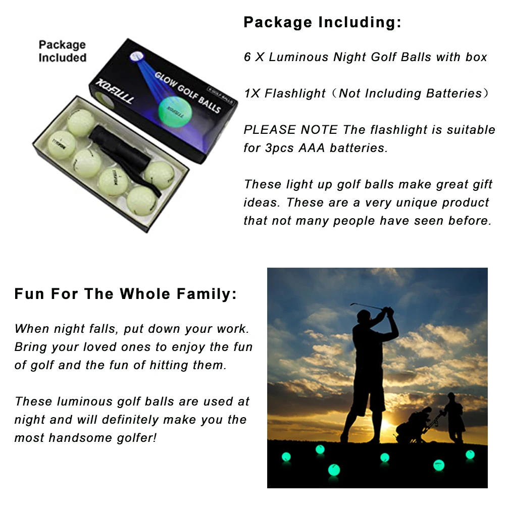 Посылка включает:6 светящихся мячей для гольфа с коробкой1X фонарик (не включая батарейки)Обратите внимание, что фонарик подходит для аккумуляторов AAA.