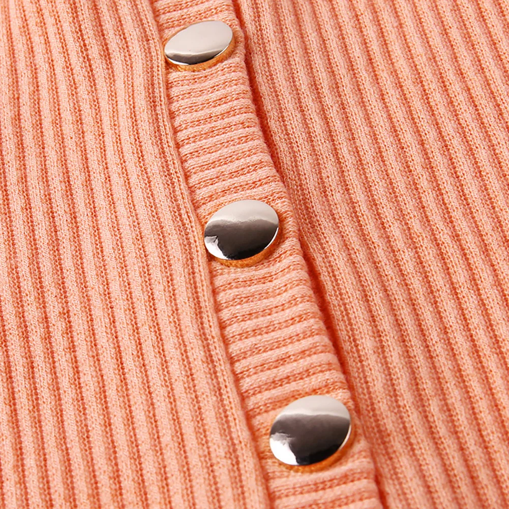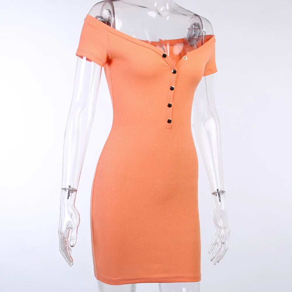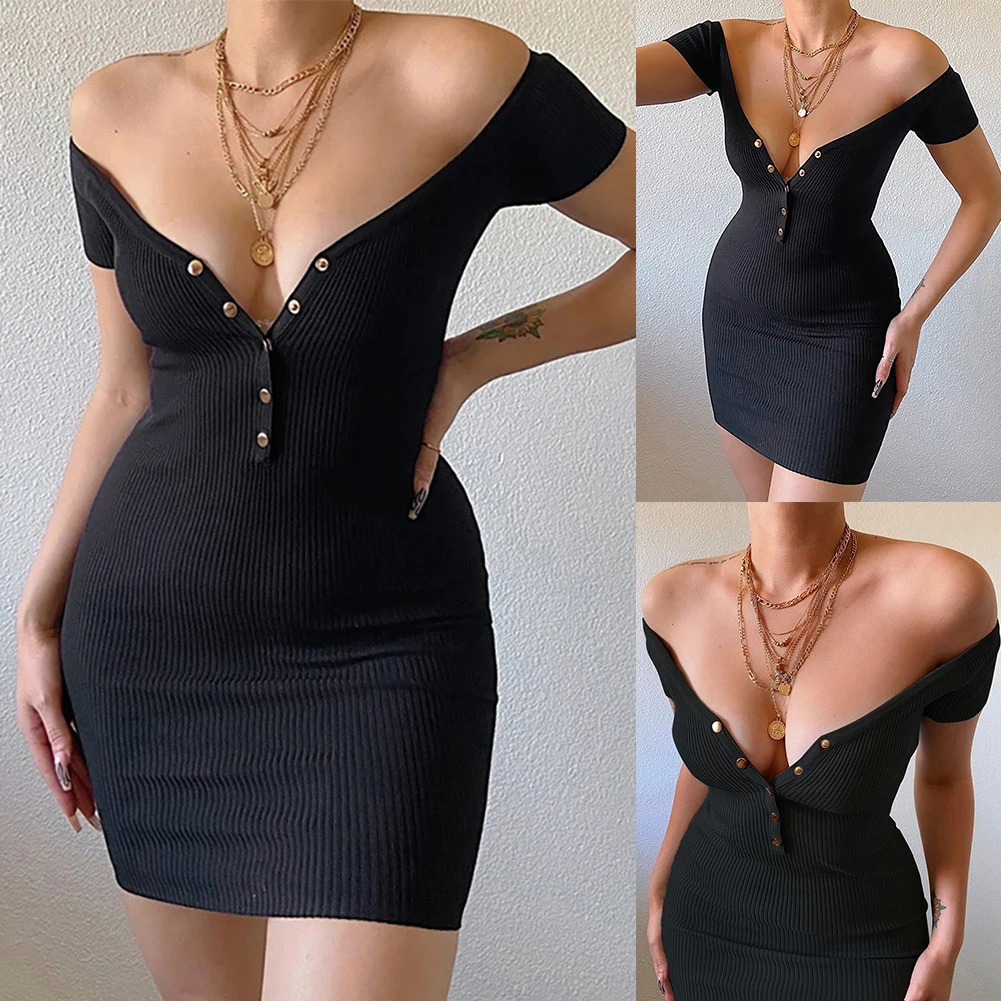 Women Sexy Solid Color Off Shoulder Buttons Deep V Neck Knit Bodycon Slim Dress