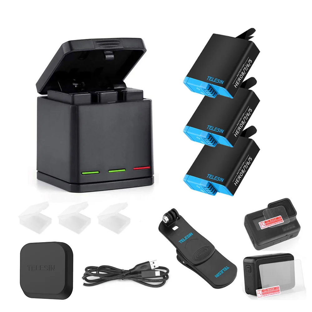 1 х 3 слота зарядное устройство 3x Аккумулятор для Hero 8 Black 3х батарейный блок 1x кабель Type-c 1x Зажим для рюкзака 1x закаленное стекло объектива 1x закаленное стекло для экрана