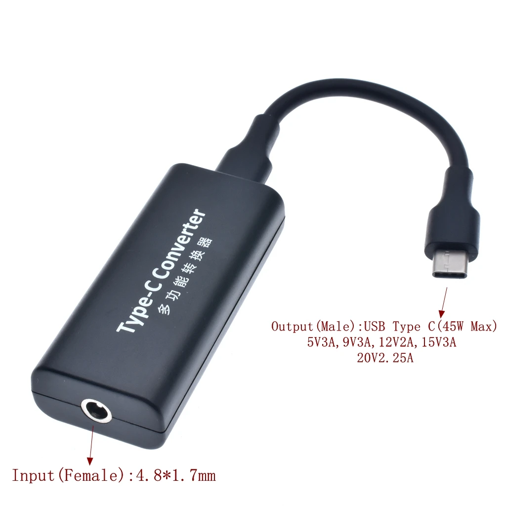 Особенности:1. Это новейший преобразователь адаптера;2, автоматический преобразователь вольт;3,Доступно для адаптера USB Type C 5 в 3A,9V3A,12V2A,15V2A,20V2.25A. Макс. 45 ВтМощность для вход (жен.): 4,8*1,7 разъем адаптер стандарта Австралии) должны будут выглядеть так же, как на или выше, чем выходное (муж.): Тип USB C)4. Вход не более 22 в.Спецификация:100% Высокое качество и абсолютно новыйТип: Кабель преобразователя постоянного токаРазъём A: 4,8*1,7 мм (такие как ноутбук адаптер переменного тока для hp 18,5 v 3.5a)Разъем (ы) B: USB Type C MaleСовместимый бренд: для любых устройств USB Type C (макс. 45 Вт)Легко подключить и использоватьТолько кабель преобразователя постоянного тока!Примечание:Пожалуйста, дважды проверьте размер соединителя перед покупкой, например, гнездовой соединитель и мужской соединитель. Кроме того, этот конвертер поддерживает только устройства 10 Вт, 15 Вт, 27 Вт, 30 Вт, 45 Вт USB C, если вход вашего ноутбука 65 Вт, возможно, он не будет работать.