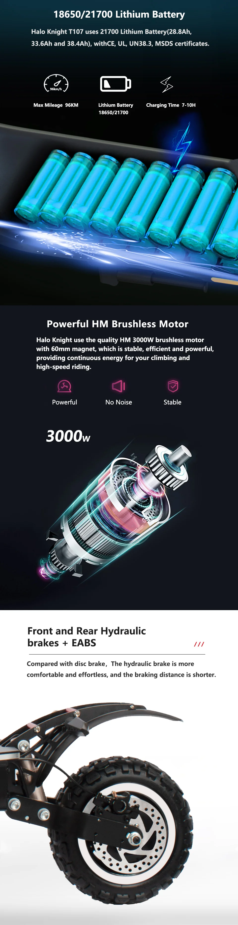 A: T107-это 60 в двойной привод, с мотором HM 60V 3000W (60 мм магнит), контроллером JP 37A, 21700 батареей 28. 8ач/33. 6ач/38,4ач, передняя и задняя амортизация, очень стабильная, не трясется на высокой скорости, яркие Угловые глаза, рог мотоцикла, задний тормозной светильник, боковой светильник s, поворотники, импортированный из Германии бесшаговый руль.