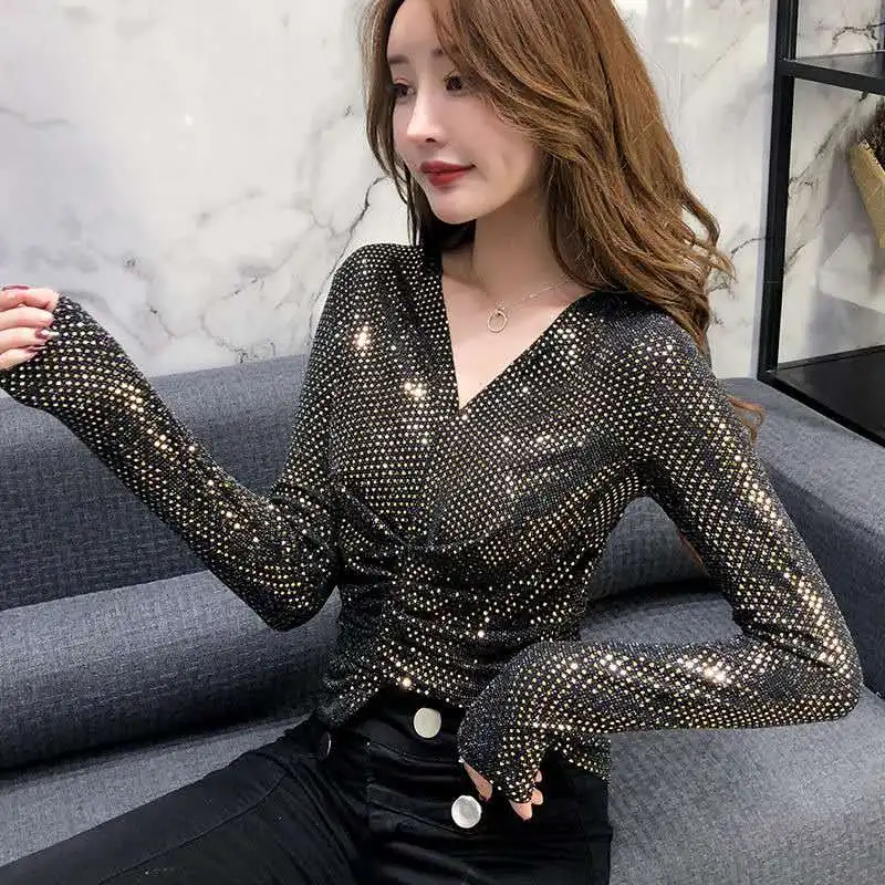 Корейская Осенняя Блестящая футболка с v-образным вырезом, расшитая бисером, женская бордовая темно-зеленая рубашка с блестками, женские топы с длинными рукавами