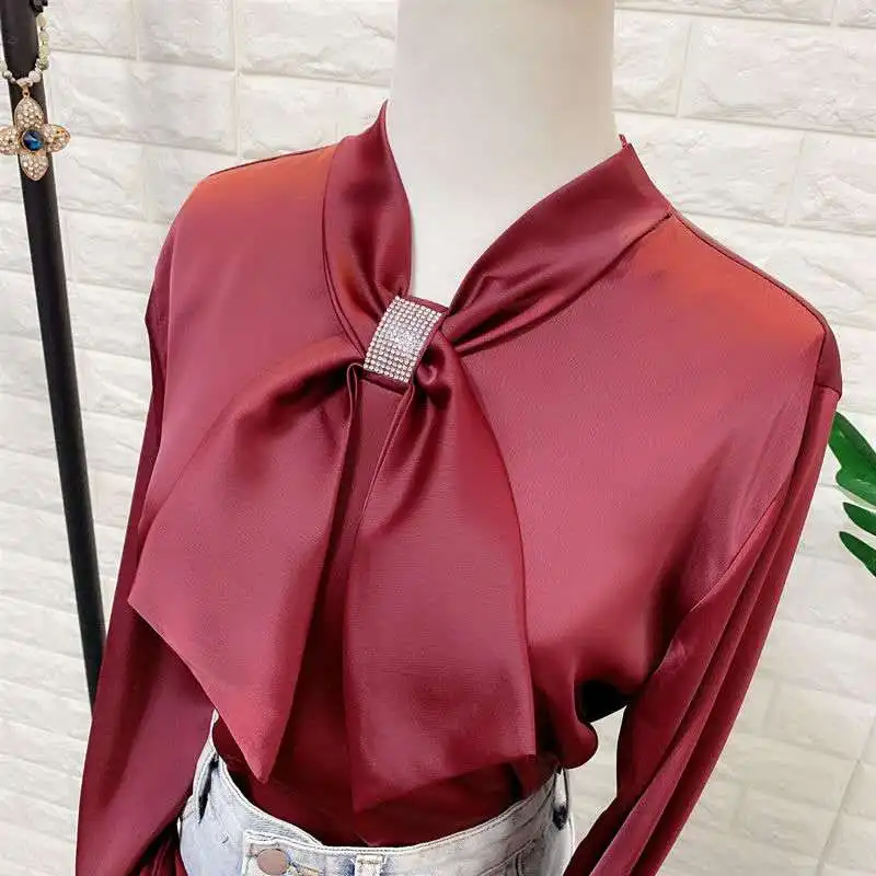 Повседневная однотонная женская рубашка, верхняя одежда, топы, Новая женская офисная униформа, блуза, стильная женская блуза с v-образным вырезом и пуговицами, свободная атласная Блуза с галстуком-бабочкой