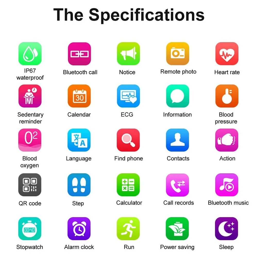 Функции: вызов по Bluetooth, мониторинг сердечного ритма, измерение артериального давления, мониторинг кислорода в крови, шагомер, измерение показателей ЭКГ, несколько спортивных режимов, шаги, калории, расстояние, мониторинг сна, музыкальный плеер, синхронизация телефонной книги, синхронизация истории вызовов, будильник, календарь, секундомер, калькулятор и т. д.