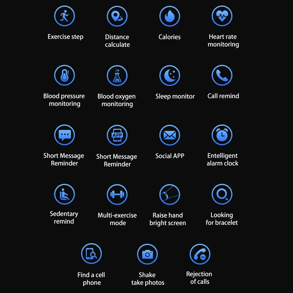 Функции: будильник, удаленная запись, поиск телефонов, мониторинг шагов, воспроизведение музыки, напоминание о сидячем положении, режим сна и т. д.