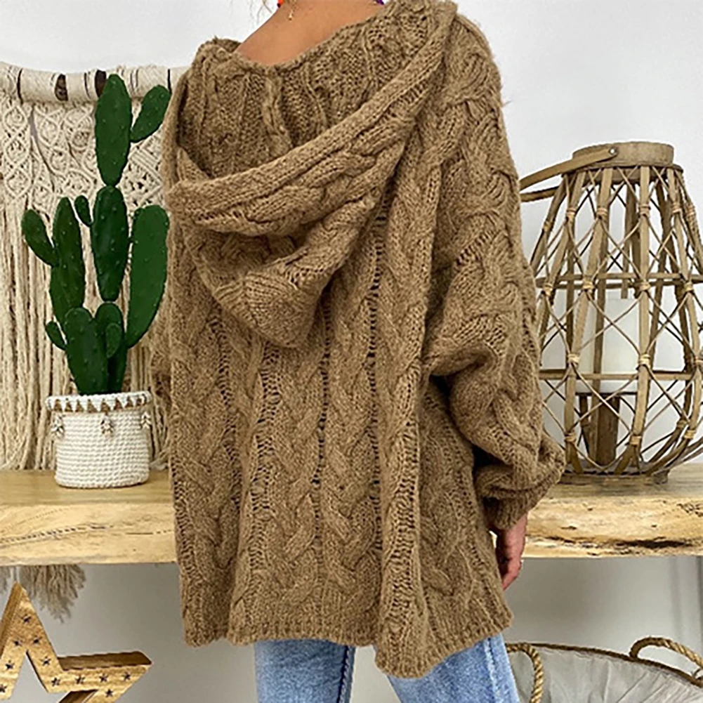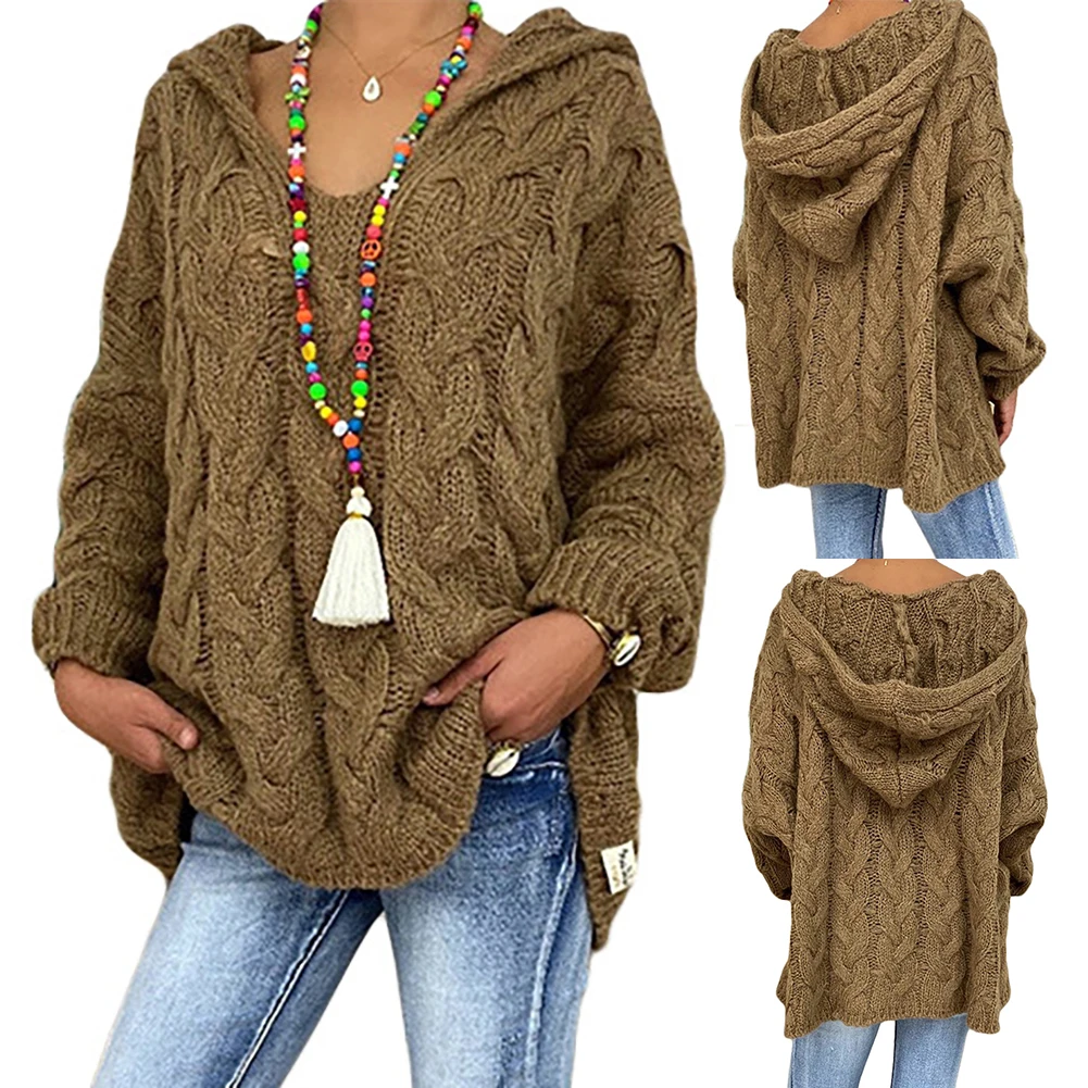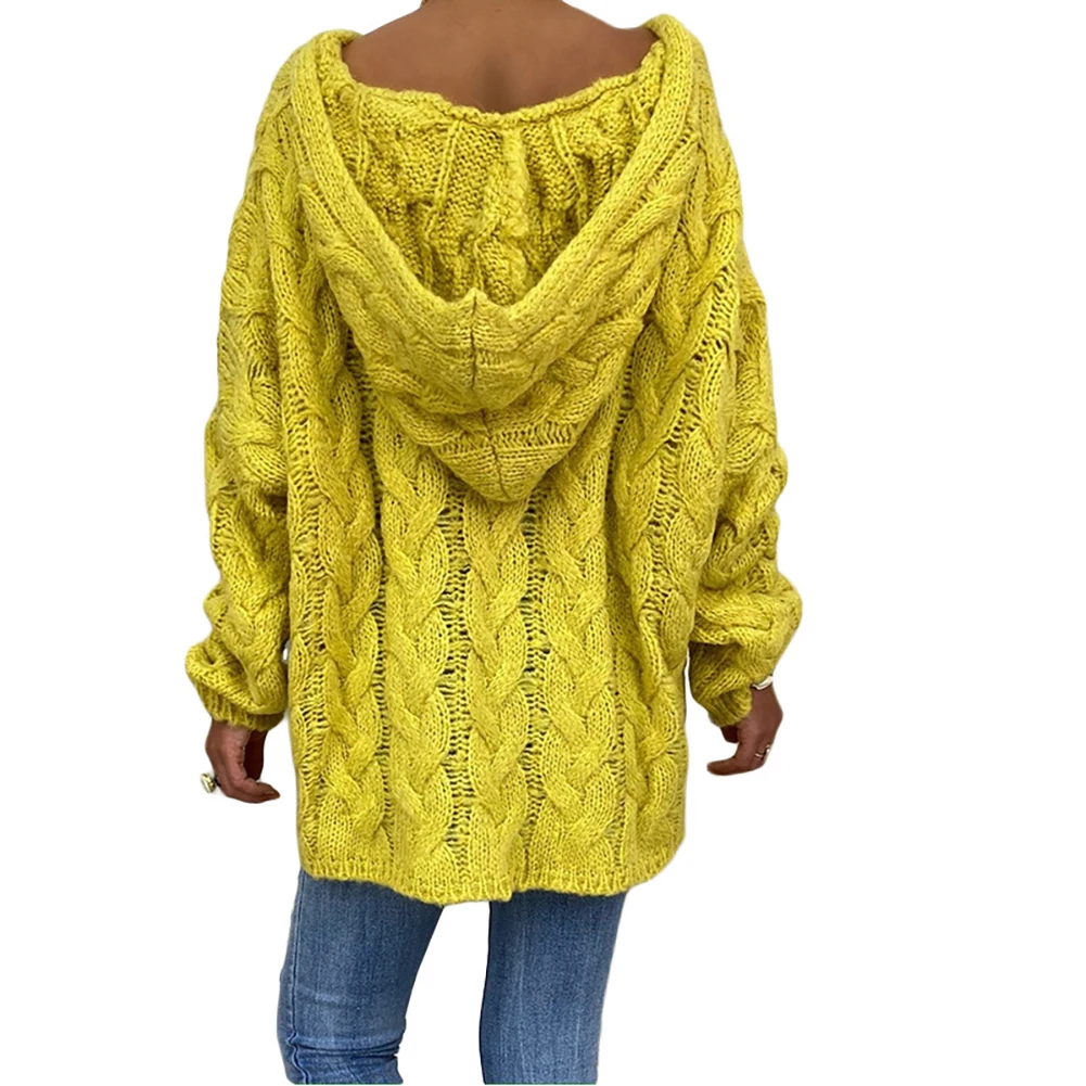 Женский Осенний Однотонный пуловер с длинным рукавом и плетеным капюшоном, вязаный свитер