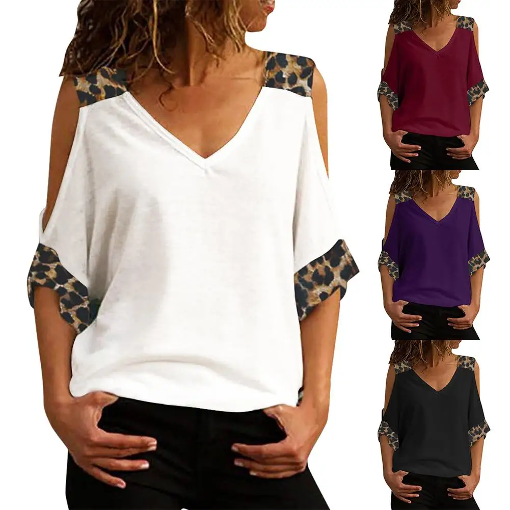 Женская модная футболка с коротким рукавом, v-образным вырезом и открытыми плечами, леопардовая Лоскутная Блузка