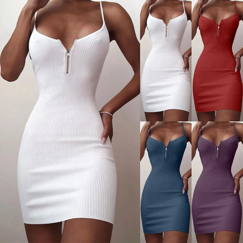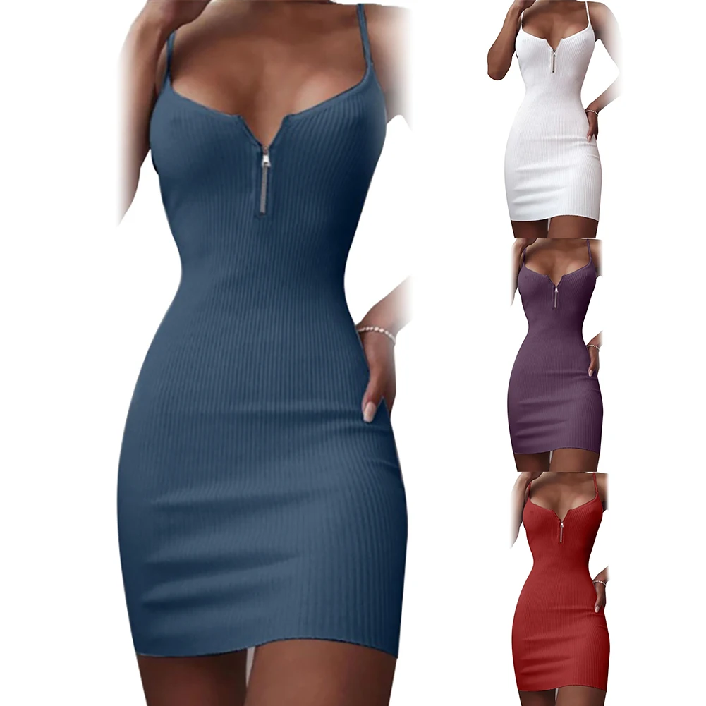 Женское сексуальное однотонное платье без рукавов с v-образным вырезом, Ребристое облегающее мини-платье на бретельках