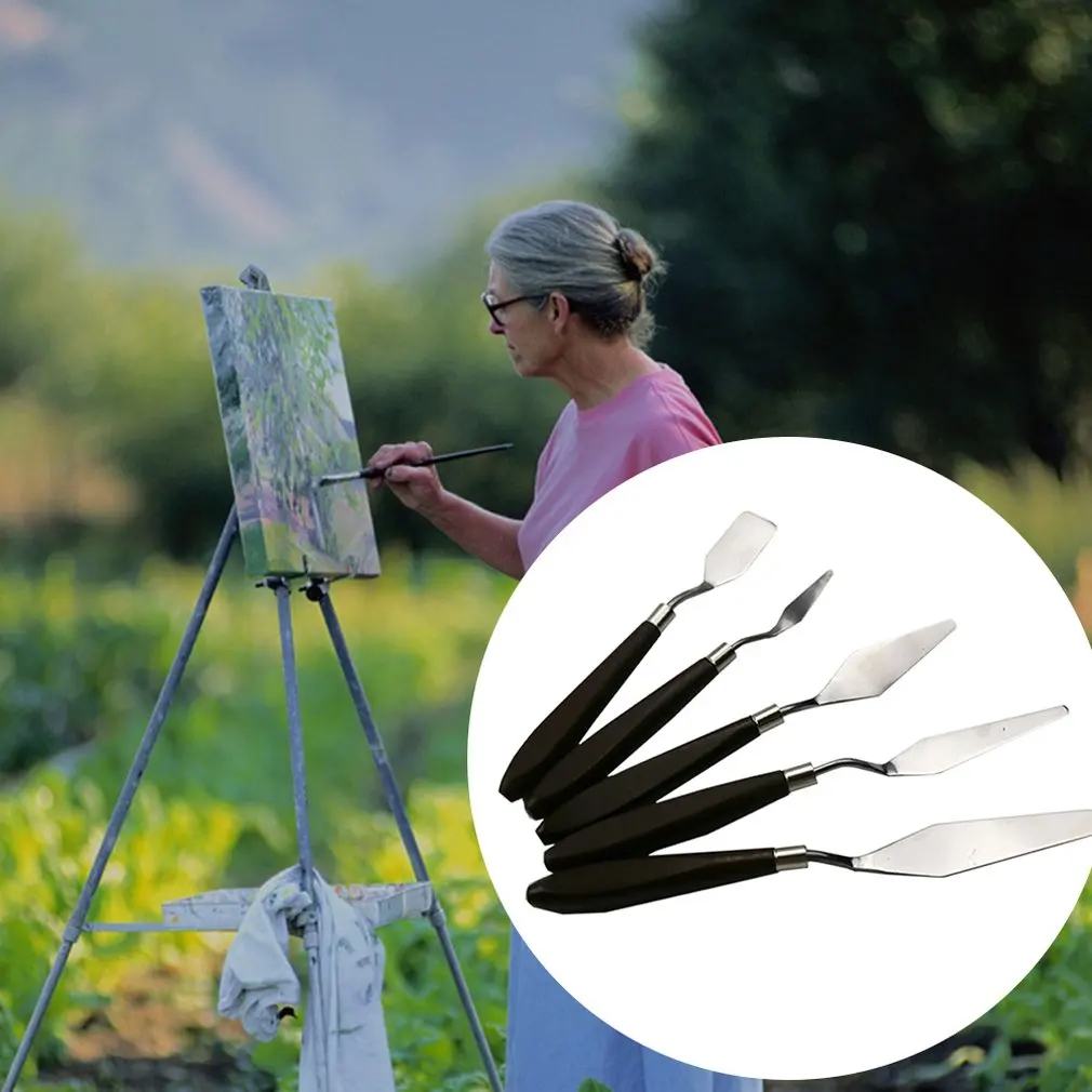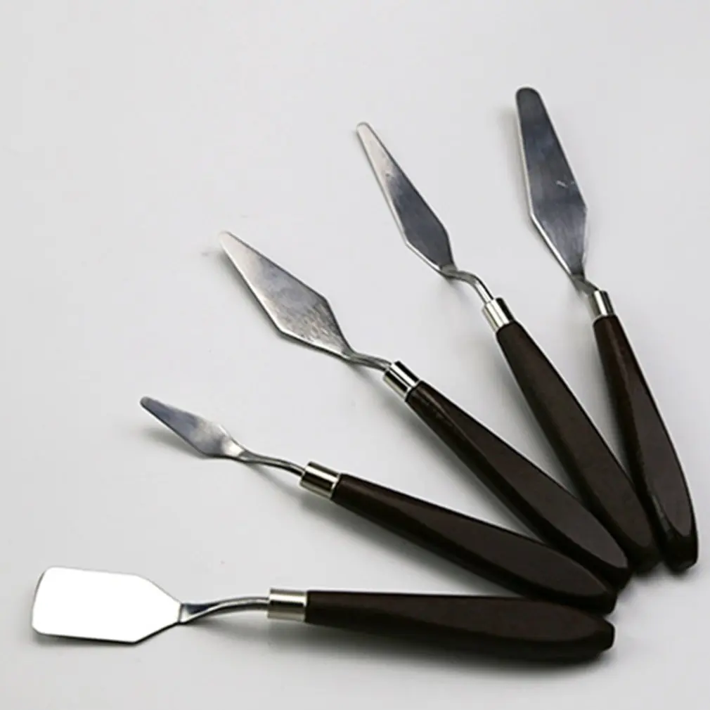 Скребок для масляной краски, 5 шт., набор с деревянной ручкой, нержавеющая сталь, инструмент для рисования, палитра, нож, лопата, инструменты для рисования