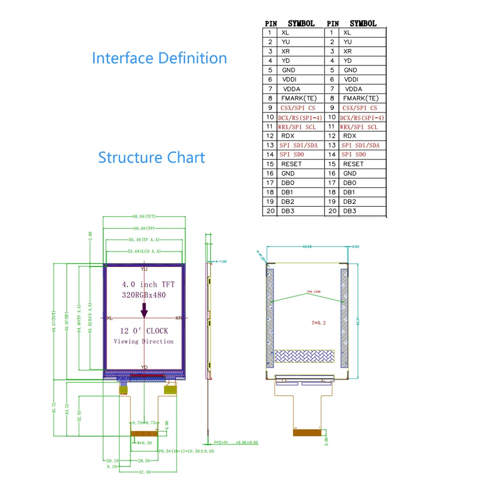 1. Описание: Это 4,0 дюймовый сенсорный ЖК-экран 320*480 TFT. 2. Особенности: 1>. Сенсорный экран 2>.4Pin SPI связь 3>. Регулируемое направление отображения 4>. 12-часовой дисплей с углом обзора 3. Параметры: 1>. Название продукта: 4,0 дюймовый сенсорный ЖК-экран 320*480 TFT 2>. Материал: цветной ЖК-экран TFT 3>. Разрешение: 320*480 4>. Чип драйвера: ST779S 5>. Размер дисплея: 4,0 дюйма 6>. Площадь дисплея: 55,68*83,52 мм 7>. Размер панели: 60,88*94,57*3,7 мм 8>. Тип интерфейса: 3pinspi/4pinspi/8Bit/16Bit GPIO 9>. Рабочее напряжение: 2,8 В-3,3 В 10>. Штифты: 0,5 мм 40Pin 11>. Вид: 12 часов 12>. Рабочий ток: 120 мА 13>. Рабочая мощность: 0,42 Вт 14>. Тип подсветки: 8 шт LED 15>. Диапазон рабочих температур:-20 ℃ ~ 70 ℃ 16>. Диапазон рабочей влажности: 5%-95% RH 4. Применение: 1>. Дисплей прибора 2>. Мобильные устройства 3>. Износостойкое устройство отображения 4>. Оборудование для мониторинга и отображения в реальном времени 5 посылка 1>.1 шт. 4,0 дюйма 320*480 TFT ЖК сенсорный экран